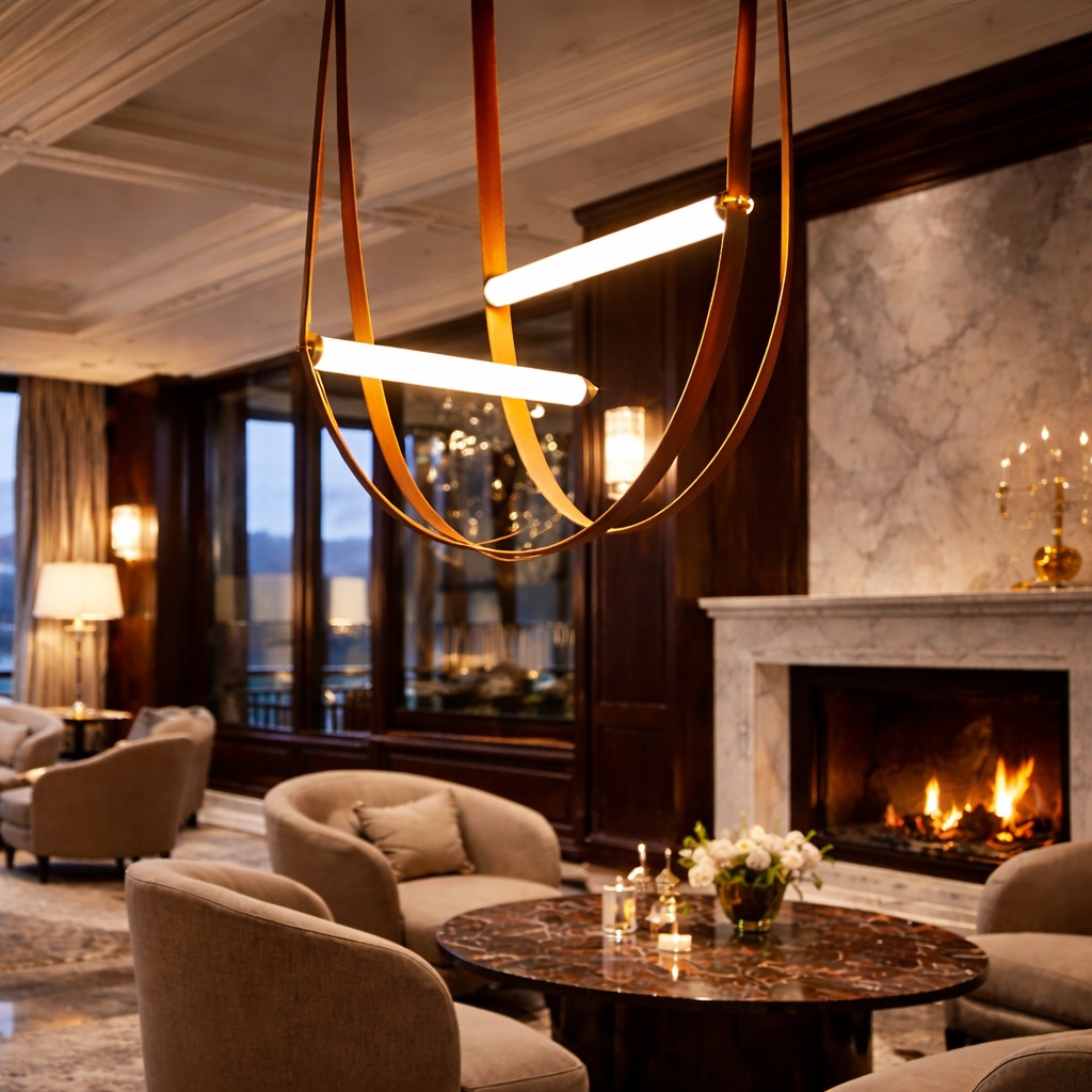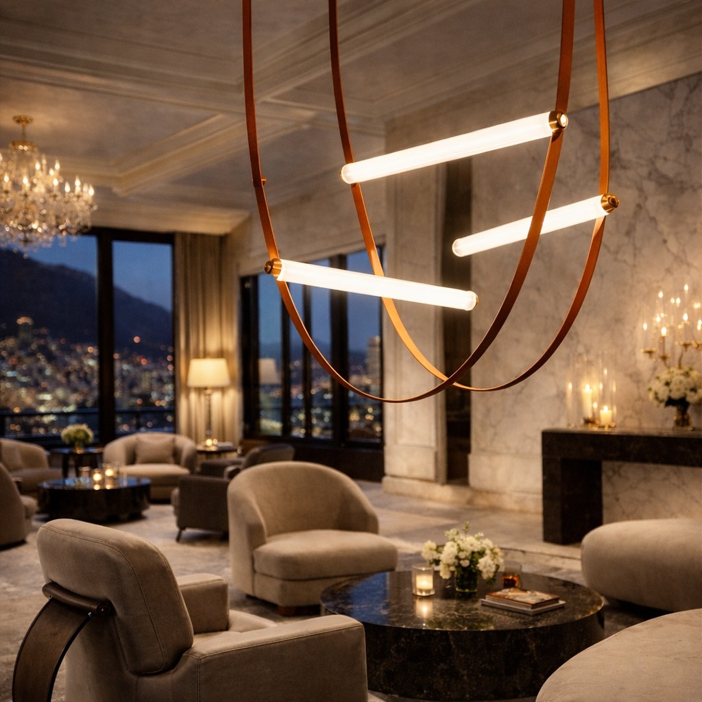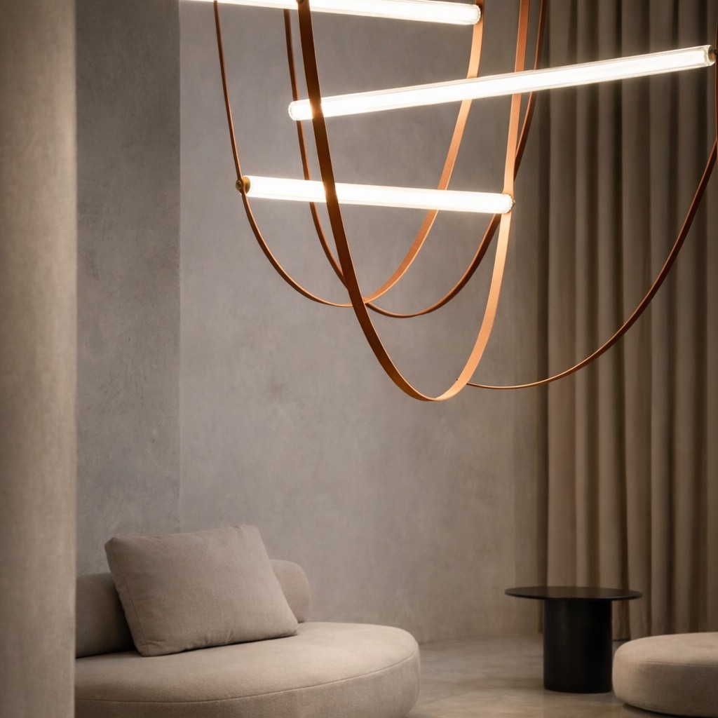 Alta Wave A refined interplay of craftsmanship and light, this leather strap glass pendant transforms illumination into an artful statement. Hand-finished leather straps suspend sleek glass light elements in fluid, architectural lines, creating a composition that feels both soft and sculptural. The warm glow diffused through glass contrasts beautifully with the natural texture of leather, delivering understated elegance and modern sophistication—ideal for luxury hospitality, boutique interiors, and curated residential spaces.