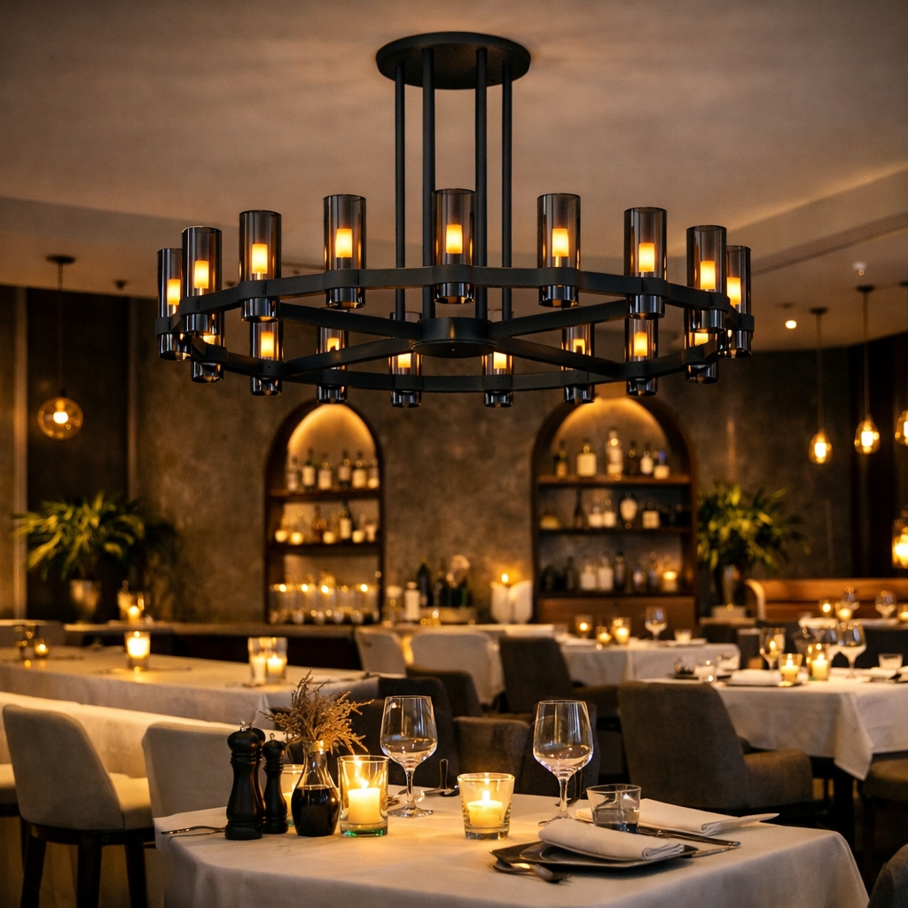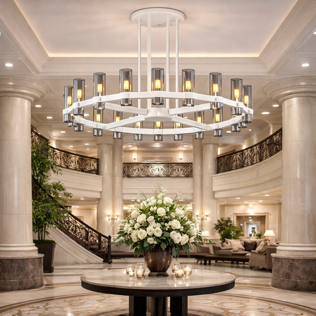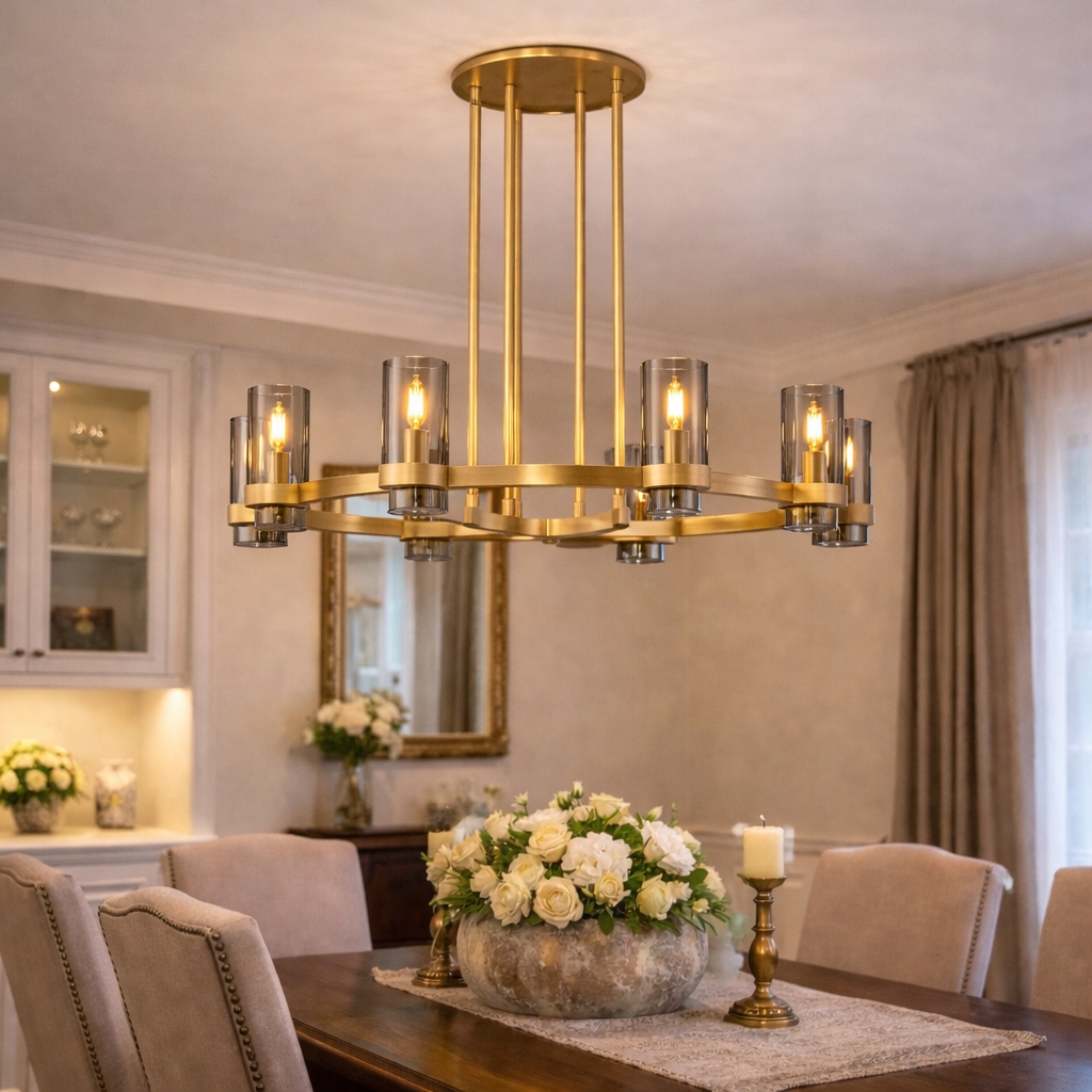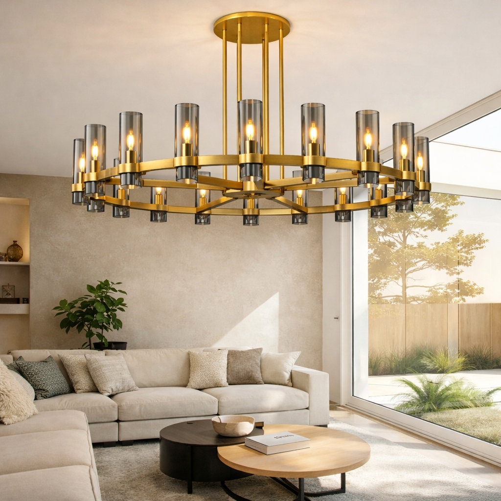 Andermatt Collection is a modern chandelier series featuring brushed brass frames and clear cylindrical glass shades with G9 LED light sources. Designed in modular ring and linear configurations, it delivers elegant ambient lighting with flexible installation options, ideal for hospitality, dining, and high-end residential spaces.