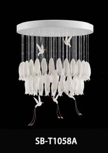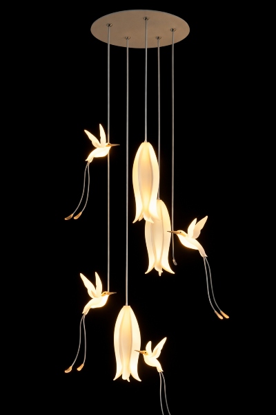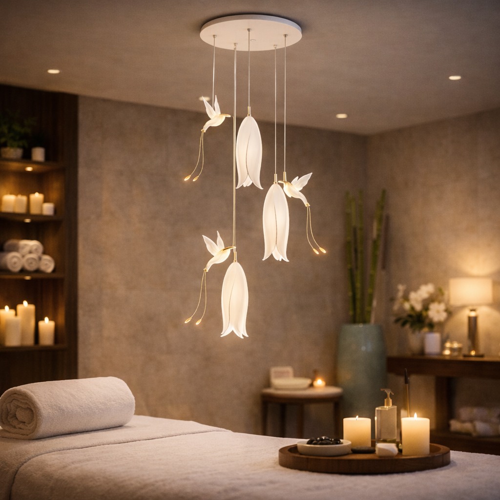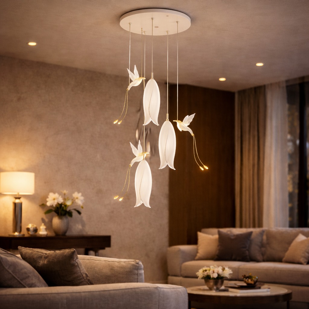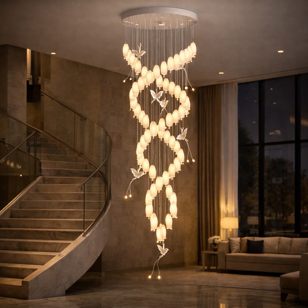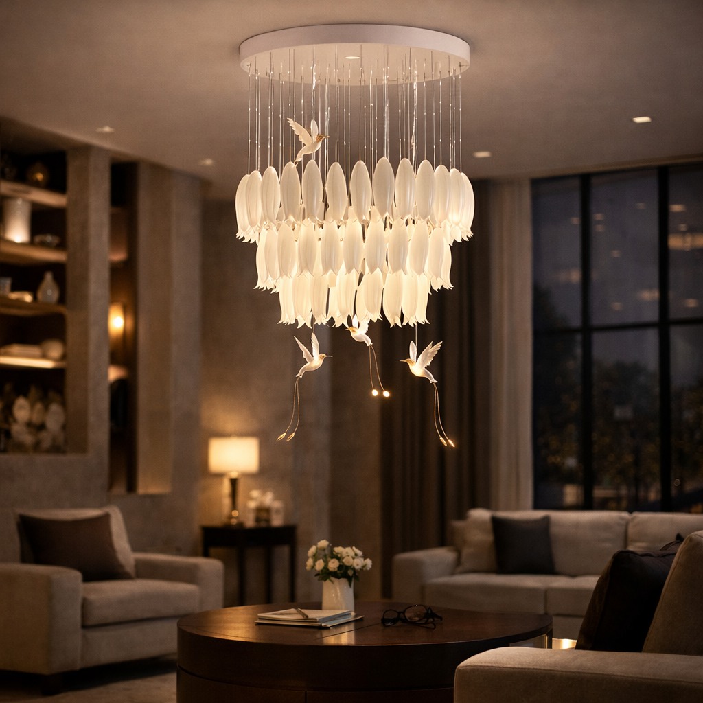 AURON Collection features elegant ceramic petal pendants arranged in cascading compositions, accented with delicate bird elements to create a light, sculptural presence within the space. Designed for dramatic vertical installations, the collection delivers soft, ambient illumination with refined decorative detail, making it ideal for hotel lobbies, atriums, luxury residences, and statement interiors. Custom configurations are available to suit a wide range of ceiling heights and architectural layouts.