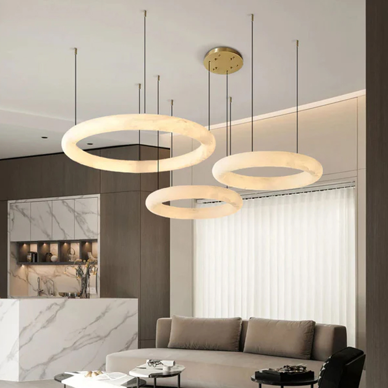 Breckenridge-A glorious glow Natural Marble Ceiling Chandelier range of 19.29”, 23.23”, 27.17”,31.10”., 6500 color finishes and suspension cable different lengths are available. 2700K/3000K/3500K/4000K Field color selectable by selector switch. RGBW and CCT tunable / dimmable using remote, DMX , App and Google Alexa