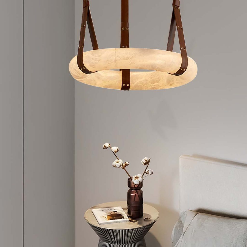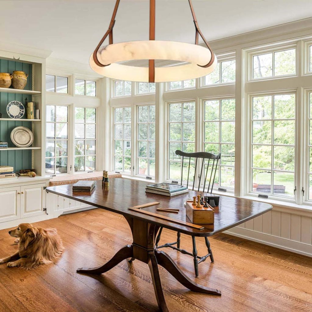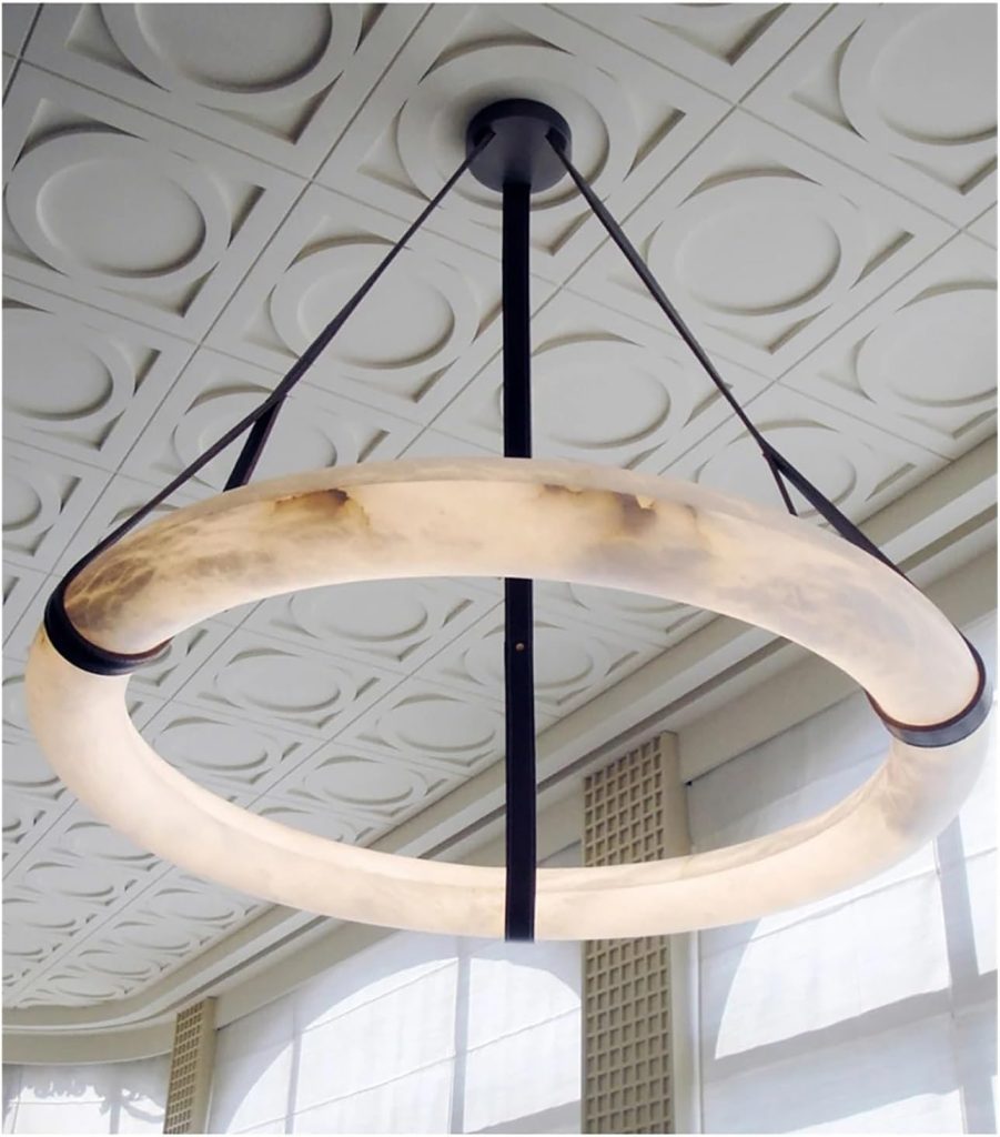 Breckenridge-B glorious glow Natural Marble Leather Straps Ceiling Chandelier range of 19.70”, 23.60”, 31.50”, 39.40”, 6500 color finishes and suspension cable different lengths are available. 2700K/3000K/3500K/4000K Field color selectable by selector switch. RGBW and CCT tunable / dimmable using remote, DMX , App and Google Alexa