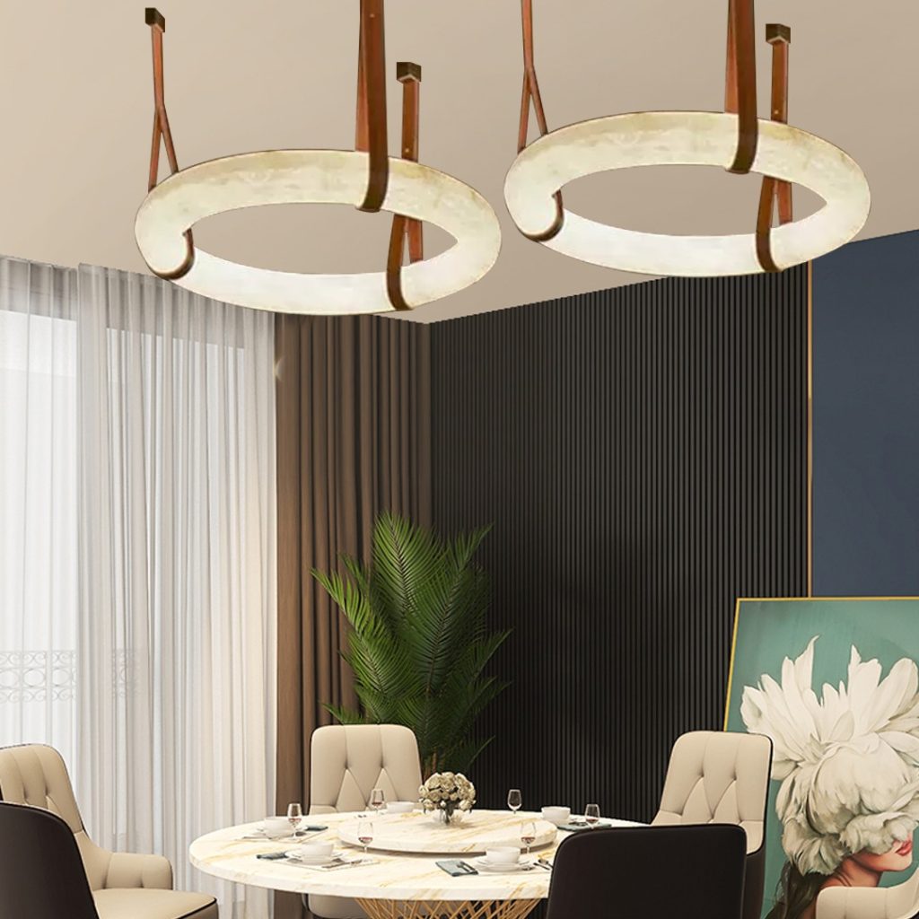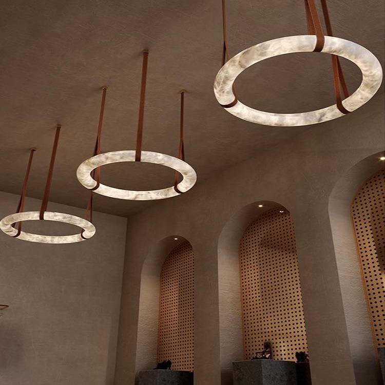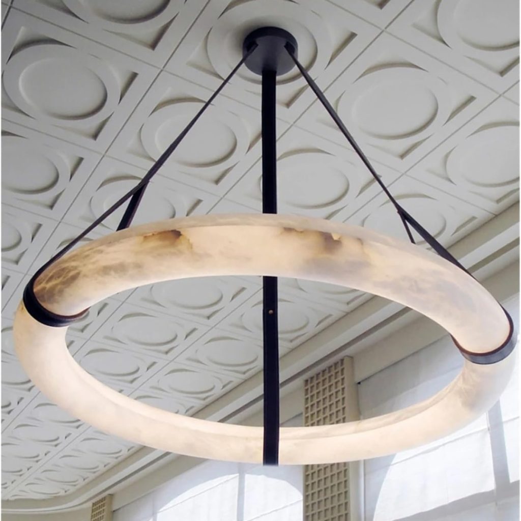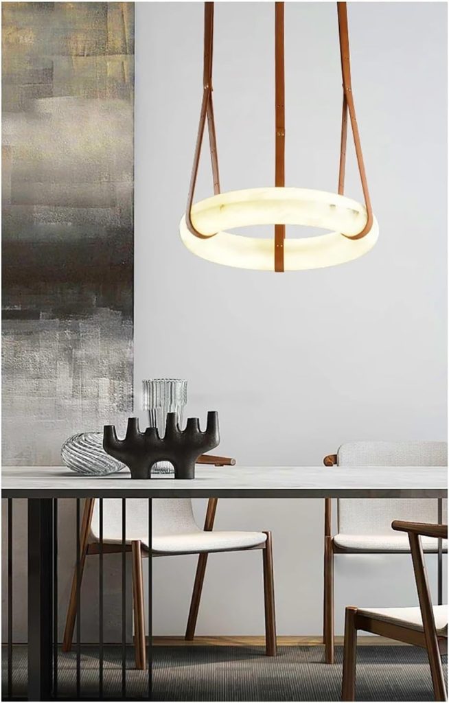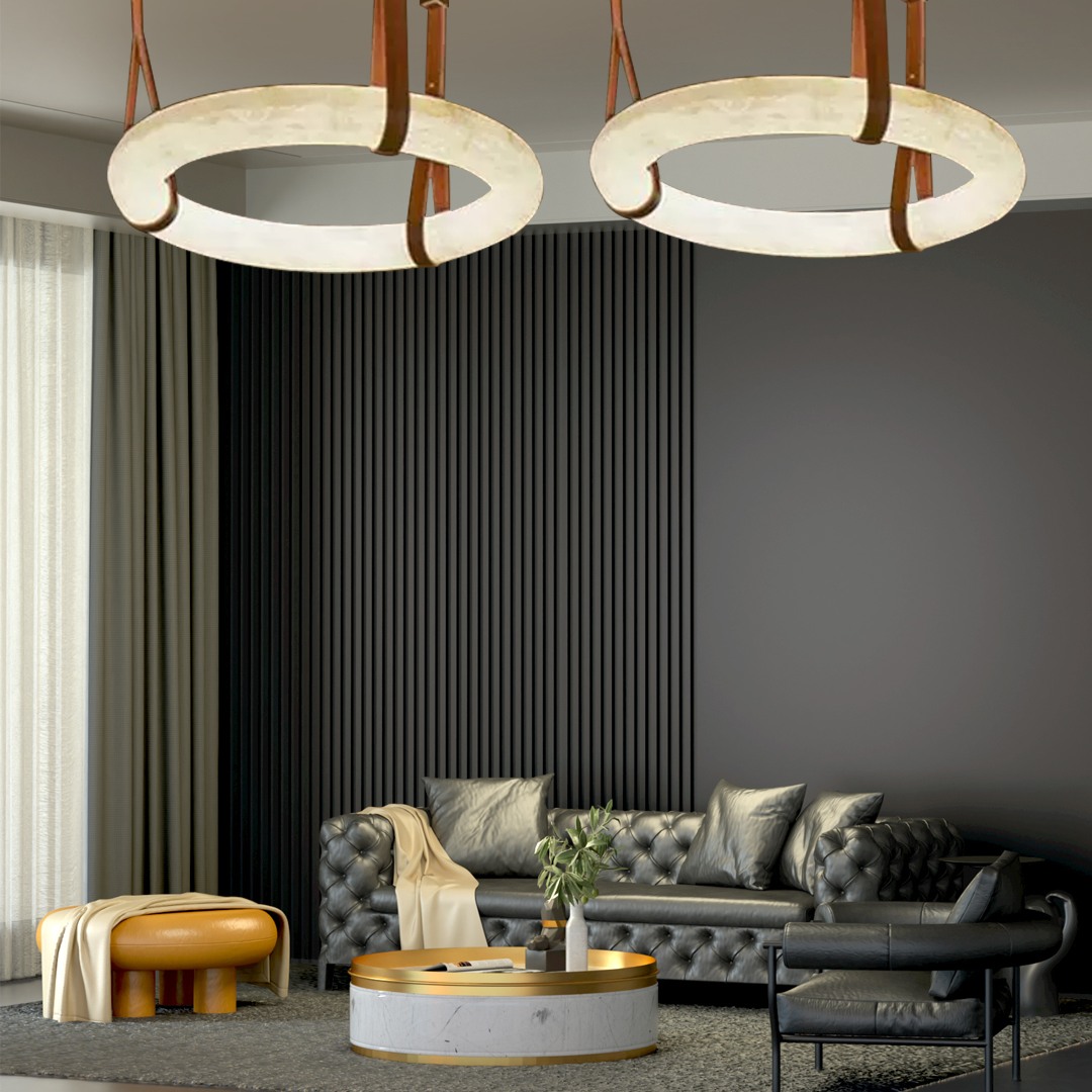 Breckenridge-C glorious glow  Natural Marble Leather Ceiling Chandelier range of  19.29”, 23.23”, 27.17”, 31.10”, 6500 color finishes and suspension cable different lengths are available. 2700K/3000K/3500K/4000K Field color selectable by selector switch. RGBW and CCT tunable / dimmable using remote, DMX ,  App and Google Alexa