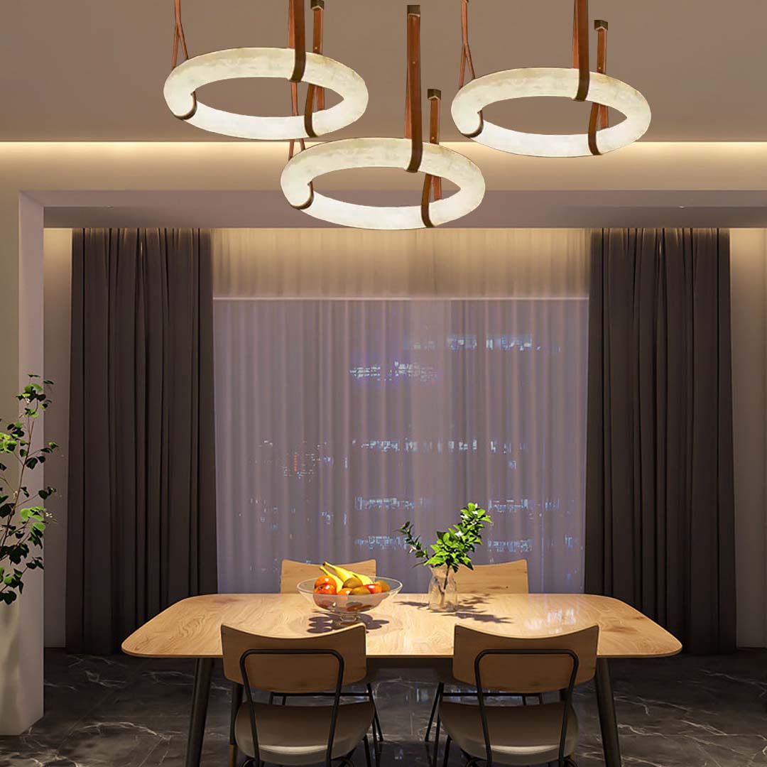 Breckenridge-B glorious glow Natural Marble Leather Straps Ceiling Chandelier range of 19.70”, 23.60”, 31.50”, 39.40”, 6500 color finishes and suspension cable different lengths are available. 2700K/3000K/3500K/4000K Field color selectable by selector switch. RGBW and CCT tunable / dimmable using remote, DMX , App and Google Alexa