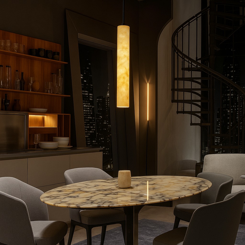 A sleek cylindrical pendant crafted from natural alabaster, showcasing soft veining and a warm, diffused glow. Its minimalist form and gentle illumination add refined elegance to kitchens, hallways, and modern hospitality spaces.
