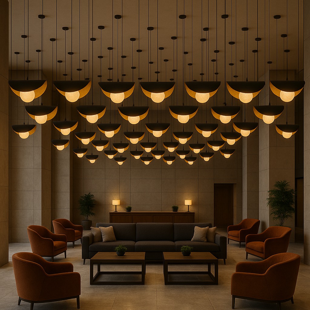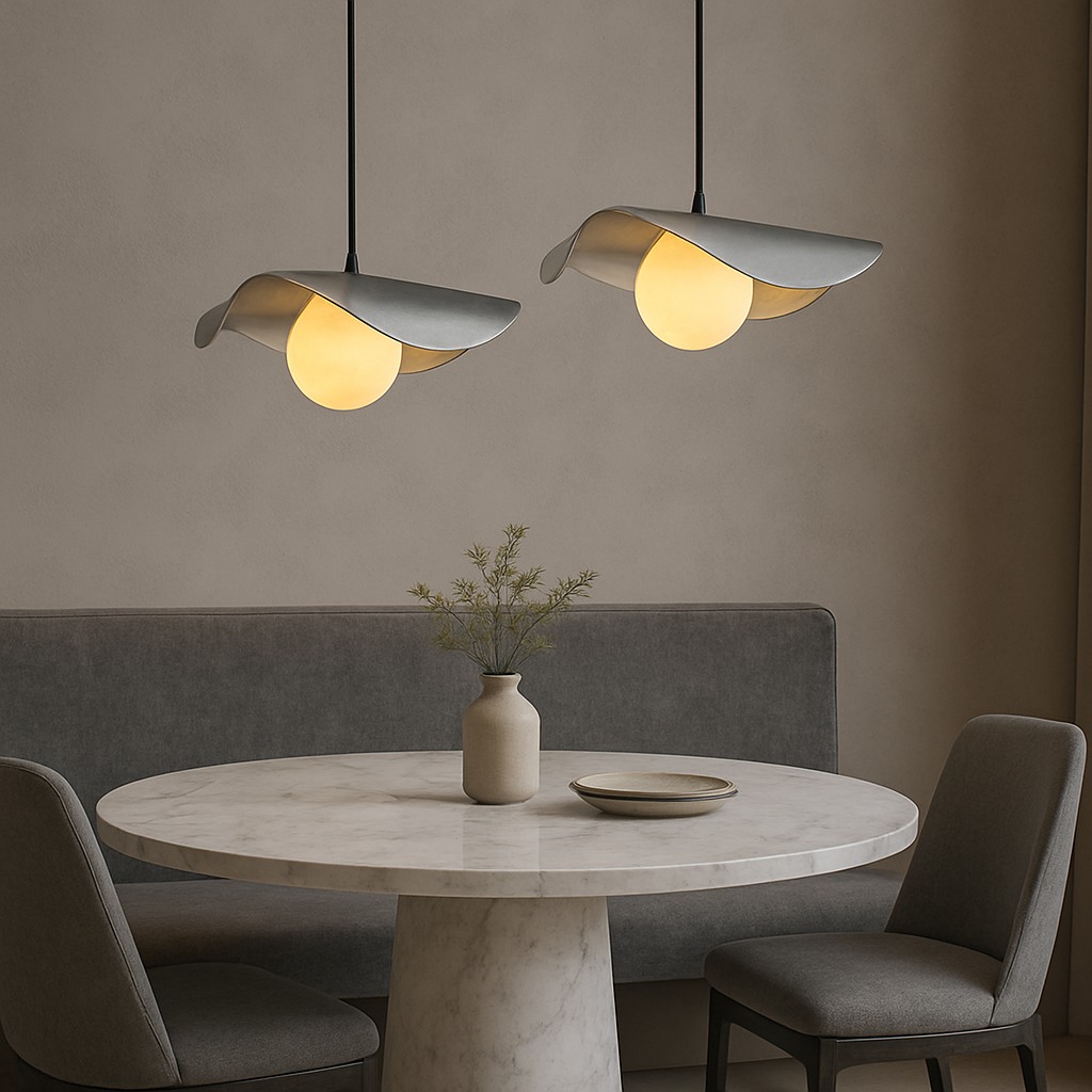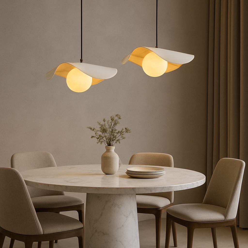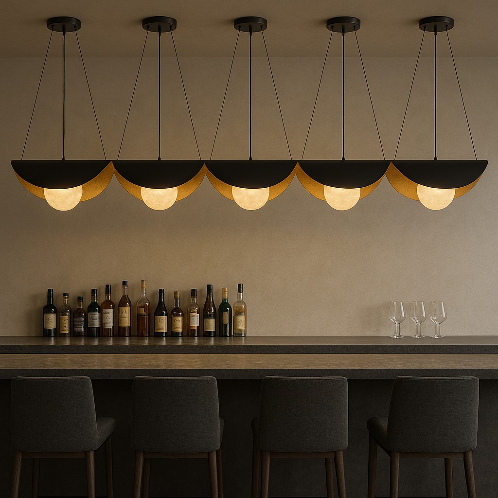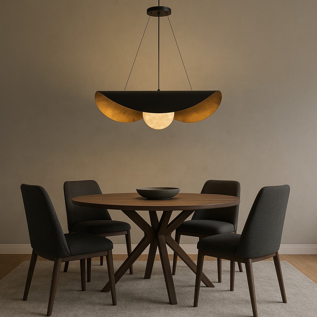A striking modern pendant featuring a black outer shell with warm brushed-gold interior accents and a softly glowing alabaster globe. Its elegant curved design creates dramatic uplight and downlight, perfect for dining rooms, bars, hotel lobbies, and upscale residential spaces. Adjustable suspension cables ensure a clean, balanced look for any ceiling height.