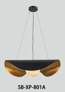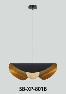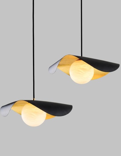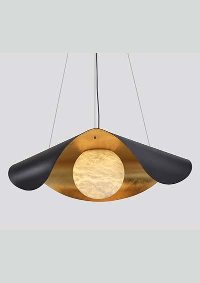 A striking modern pendant featuring a black outer shell with warm brushed-gold interior accents and a softly glowing alabaster globe. Its elegant curved design creates dramatic uplight and downlight, perfect for dining rooms, bars, hotel lobbies, and upscale residential spaces. Adjustable suspension cables ensure a clean, balanced look for any ceiling height.