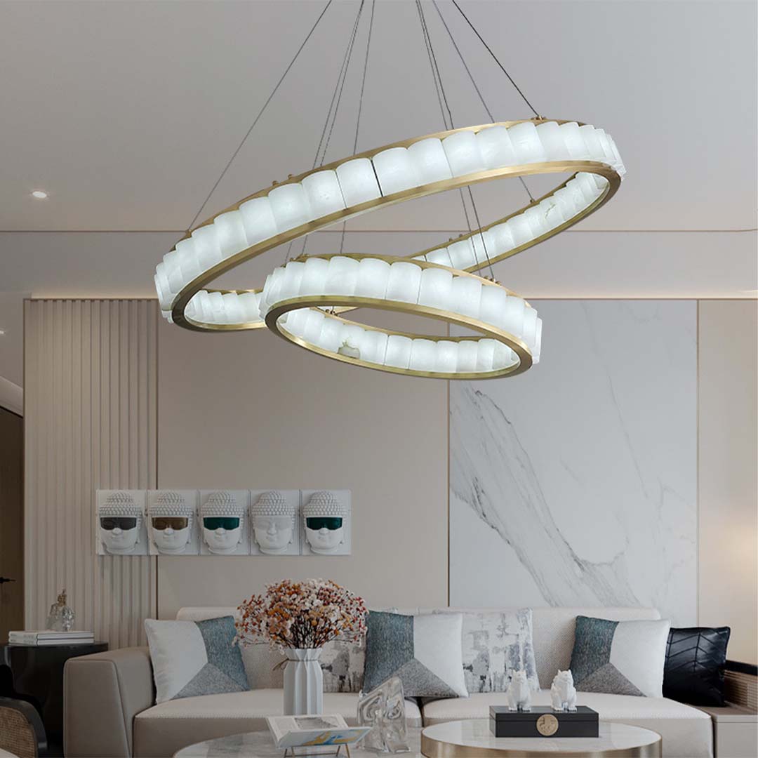 Natural Spanish Alabaster Chandelier. This fixture is a modern circular pendant chandelier featuring a gold metal frame combined with alabaster panels, the design forms a continuous illuminated ring, giving it a soft, diffused glow. The chandelier is suspended by thin, minimal cables, contributing to a sleek and elegant floating appearance. With its combination of warm metallic tones and soft white diffusers, this light is well-suited for contemporary living spaces, dining areas, upscale interiors, or hotel lobbies. It provides both aesthetic appeal and ambient lighting.