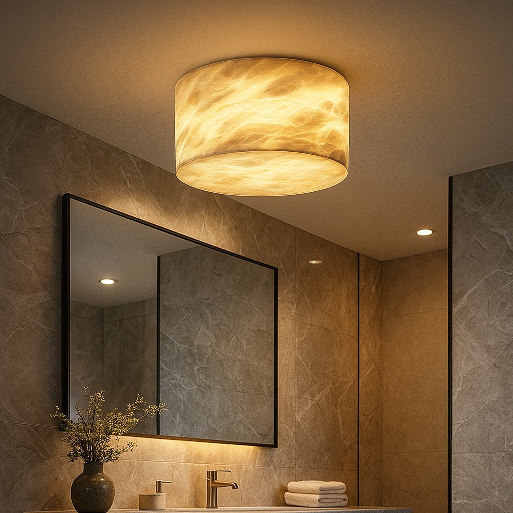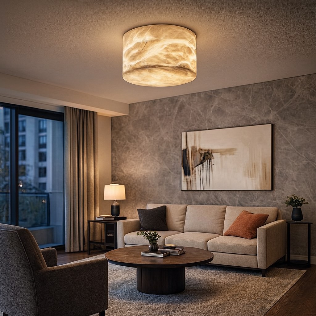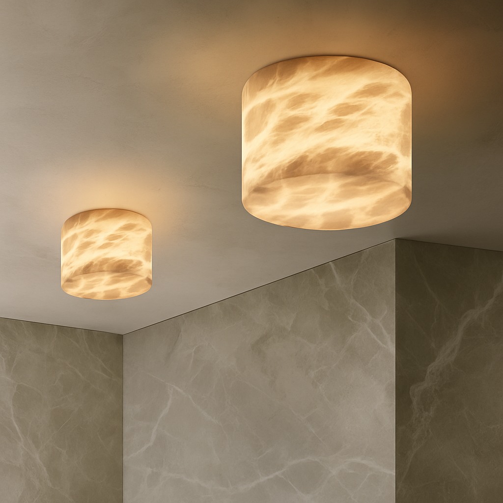 Natural Spanish Alabaster Cylinder Flush Mount A sleek flush-mount ceiling light crafted from hand-carved alabaster, providing a warm, natural glow with beautiful stone veining. Its minimal cylindrical form delivers quiet luxury, making it ideal for hallways, bedrooms, living areas, and upscale hospitality interiors. Timeless, elegant, and naturally diffused illumination.