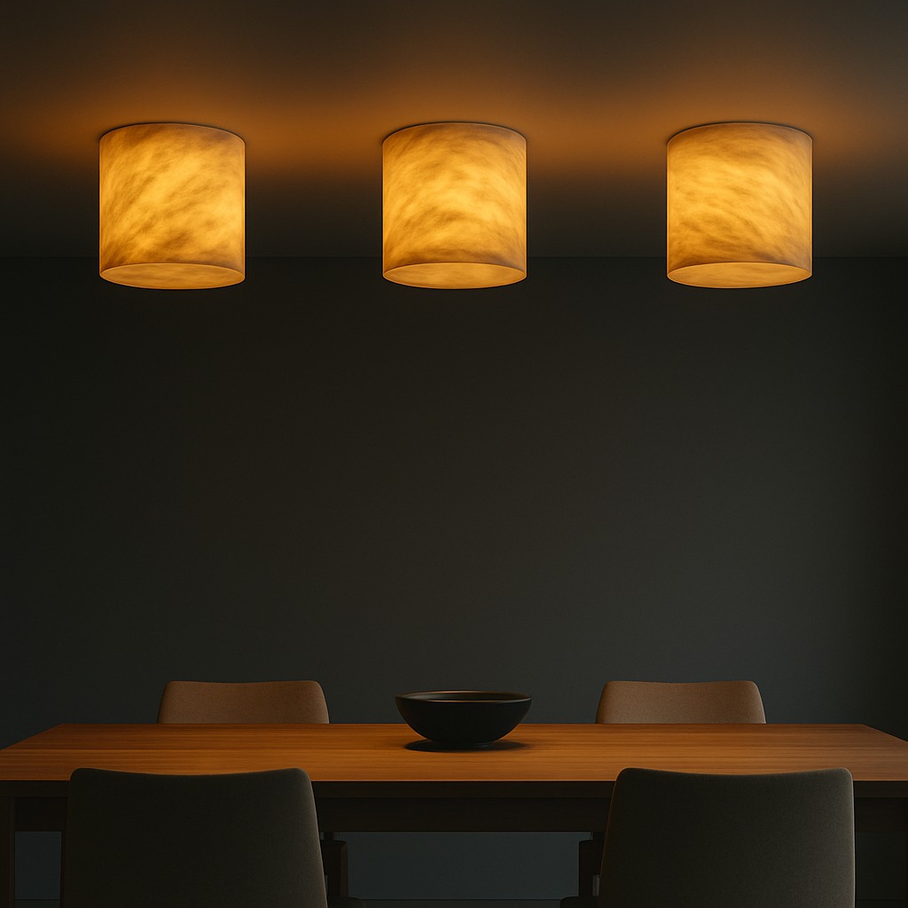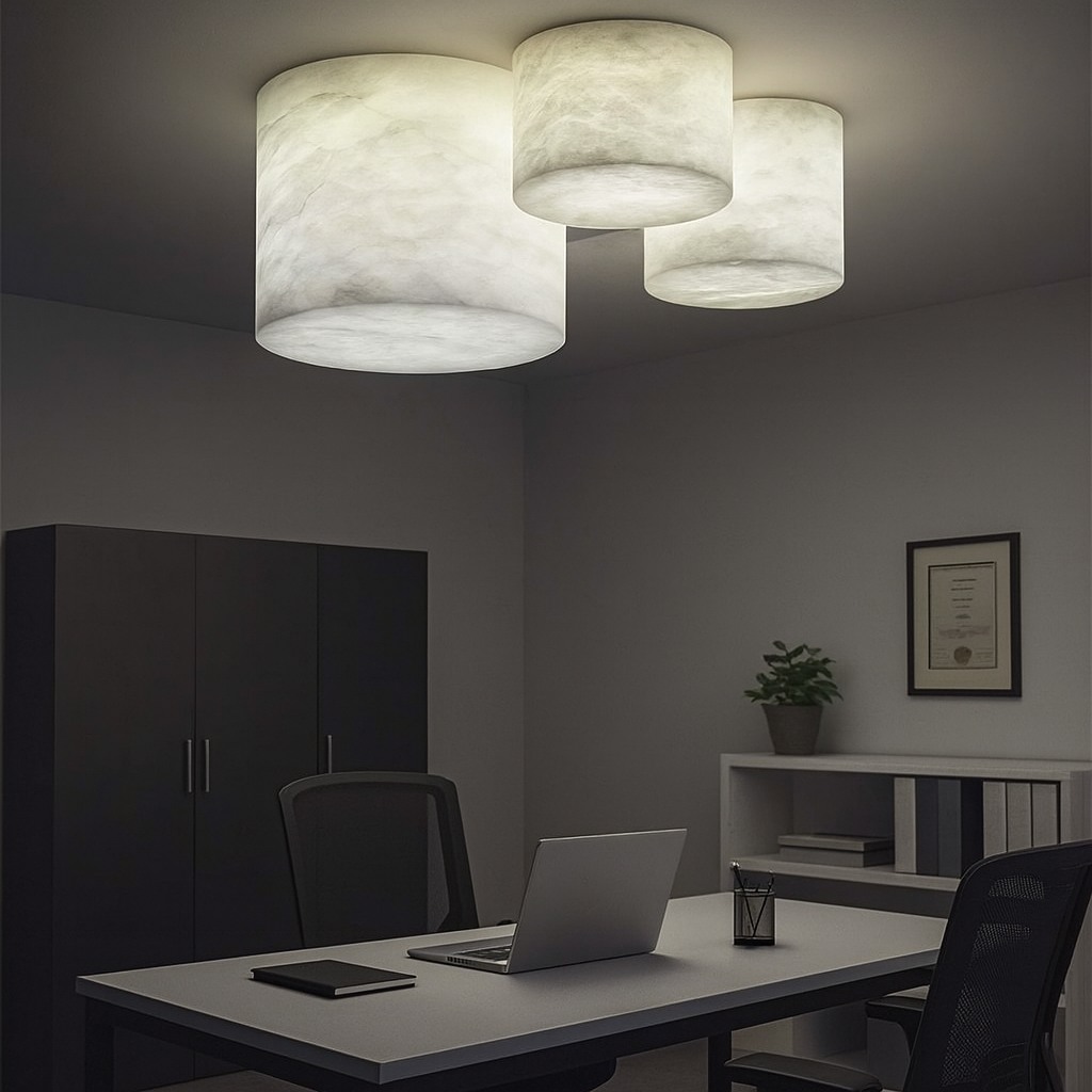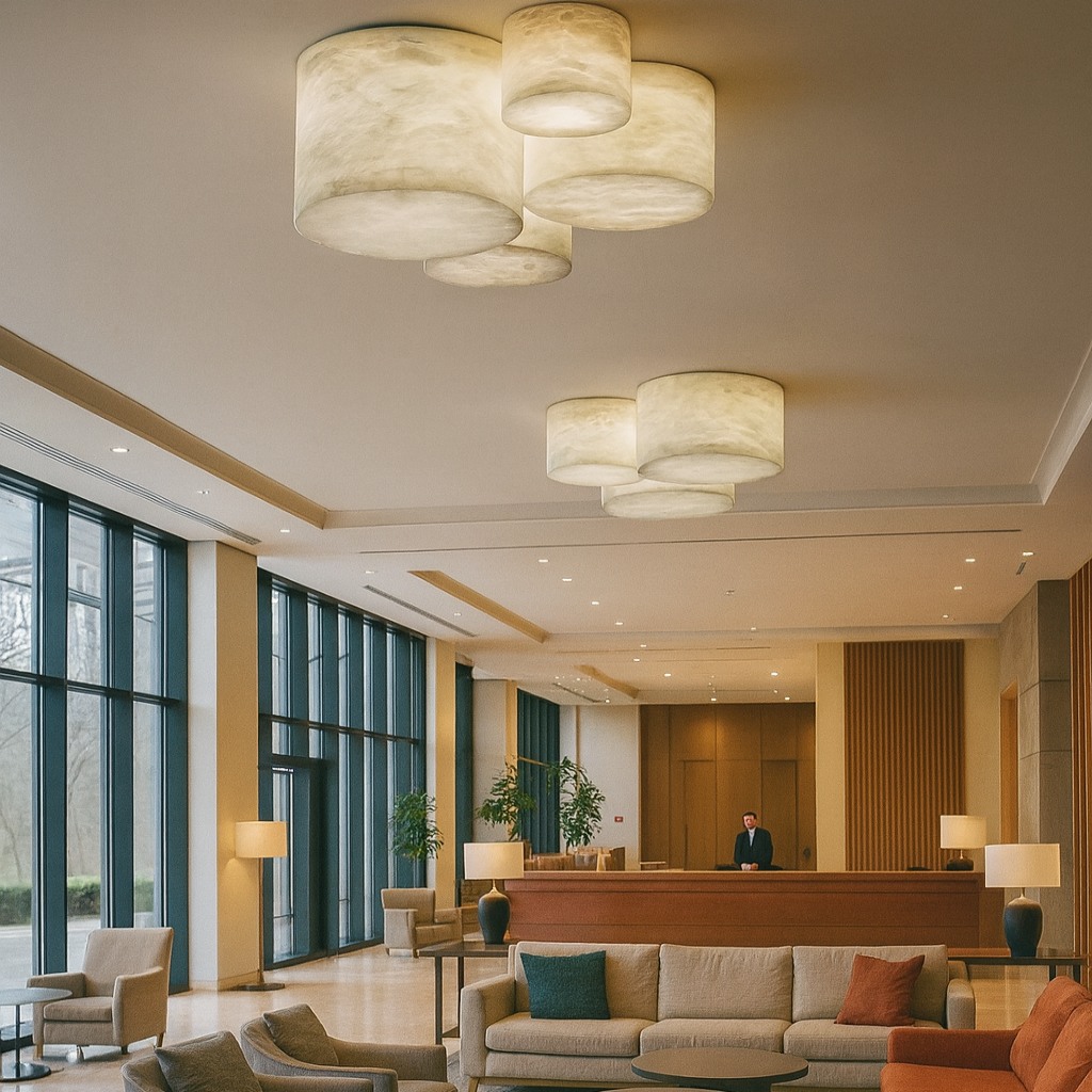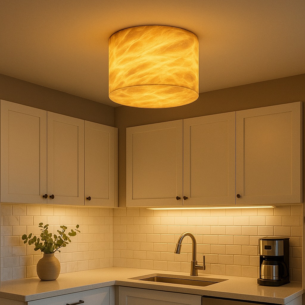 Natural Spanish Alabaster Cylinder Flush Mount A sleek flush-mount ceiling light crafted from hand-carved alabaster, providing a warm, natural glow with beautiful stone veining. Its minimal cylindrical form delivers quiet luxury, making it ideal for hallways, bedrooms, living areas, and upscale hospitality interiors. Timeless, elegant, and naturally diffused illumination.