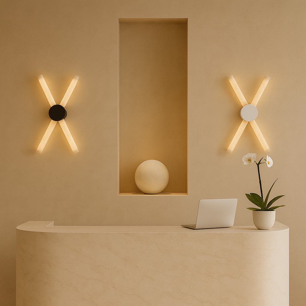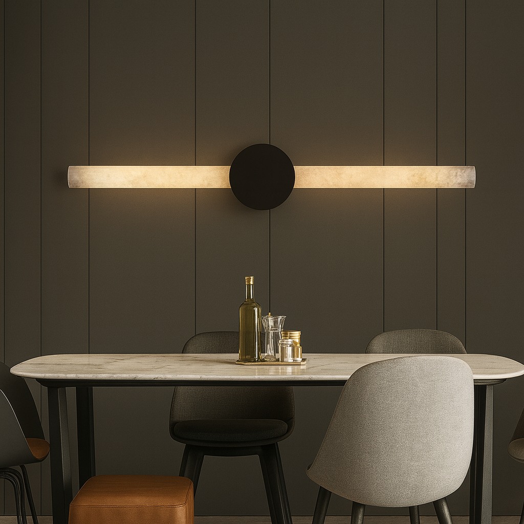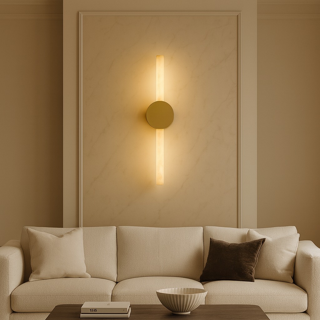 This ultra-modern alabaster wall sconce showcases a slender cylindrical stone diffuser illuminated end-to-end, anchored by a clean circular mount. When lit, the alabaster reveals elegant natural veining, filling the space with warm ambient light and subtle luxury. Ideal for boutique hotels, upscale residences, spa environments, gallery walls, and architectural spaces requiring a statement yet minimalist feature.