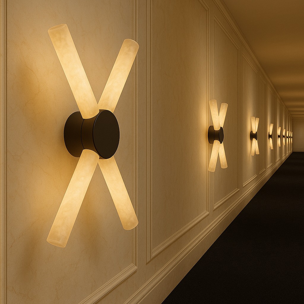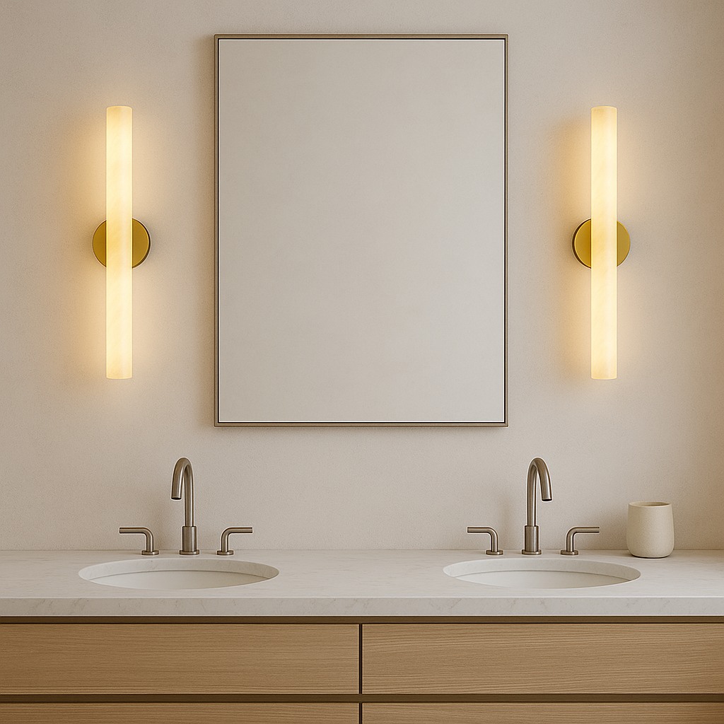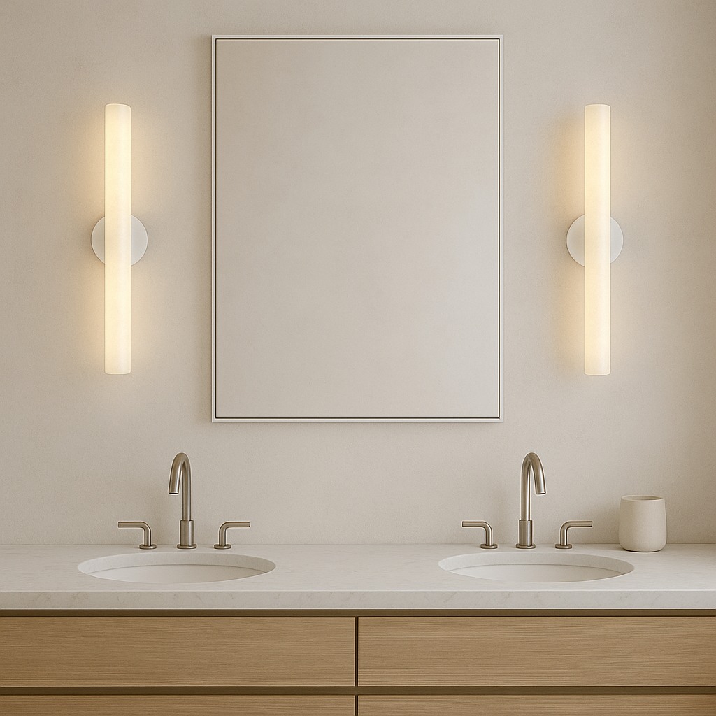 This ultra-modern alabaster wall sconce showcases a slender cylindrical stone diffuser illuminated end-to-end, anchored by a clean circular mount. When lit, the alabaster reveals elegant natural veining, filling the space with warm ambient light and subtle luxury. Ideal for boutique hotels, upscale residences, spa environments, gallery walls, and architectural spaces requiring a statement yet minimalist feature.