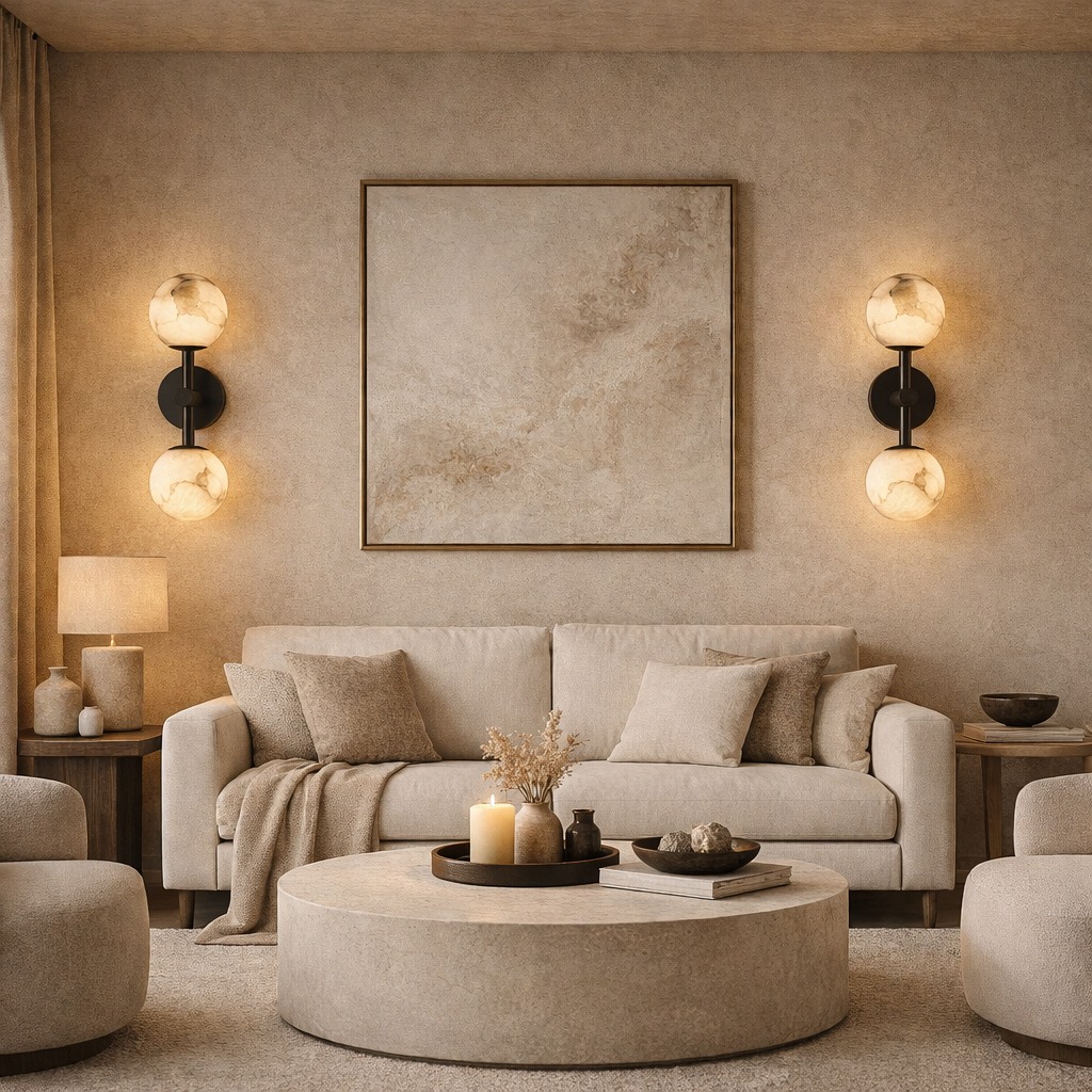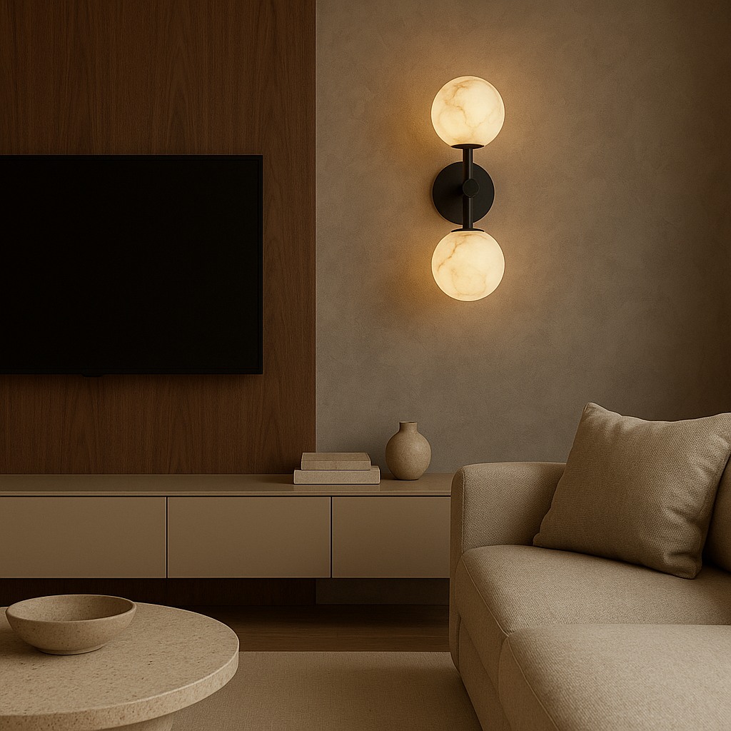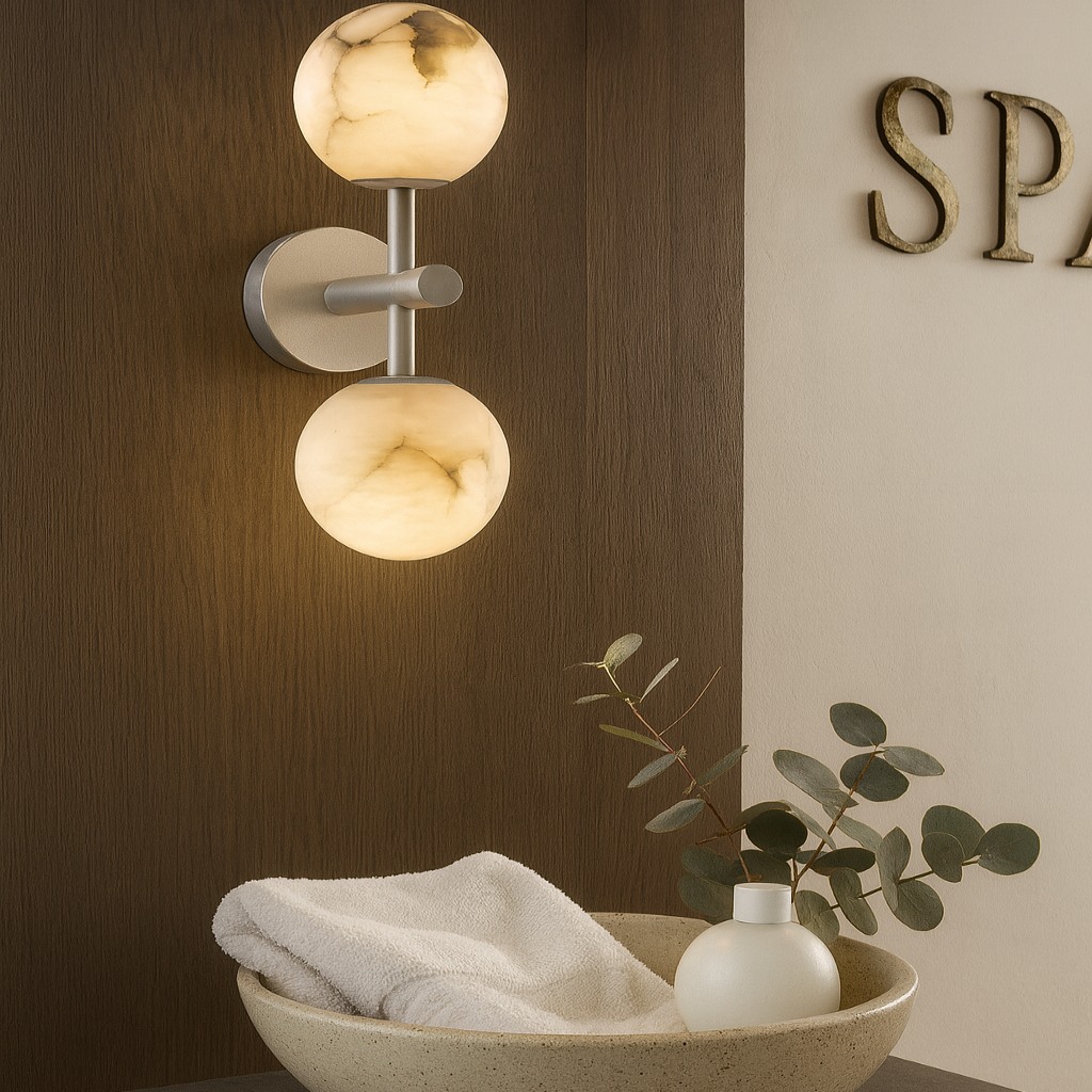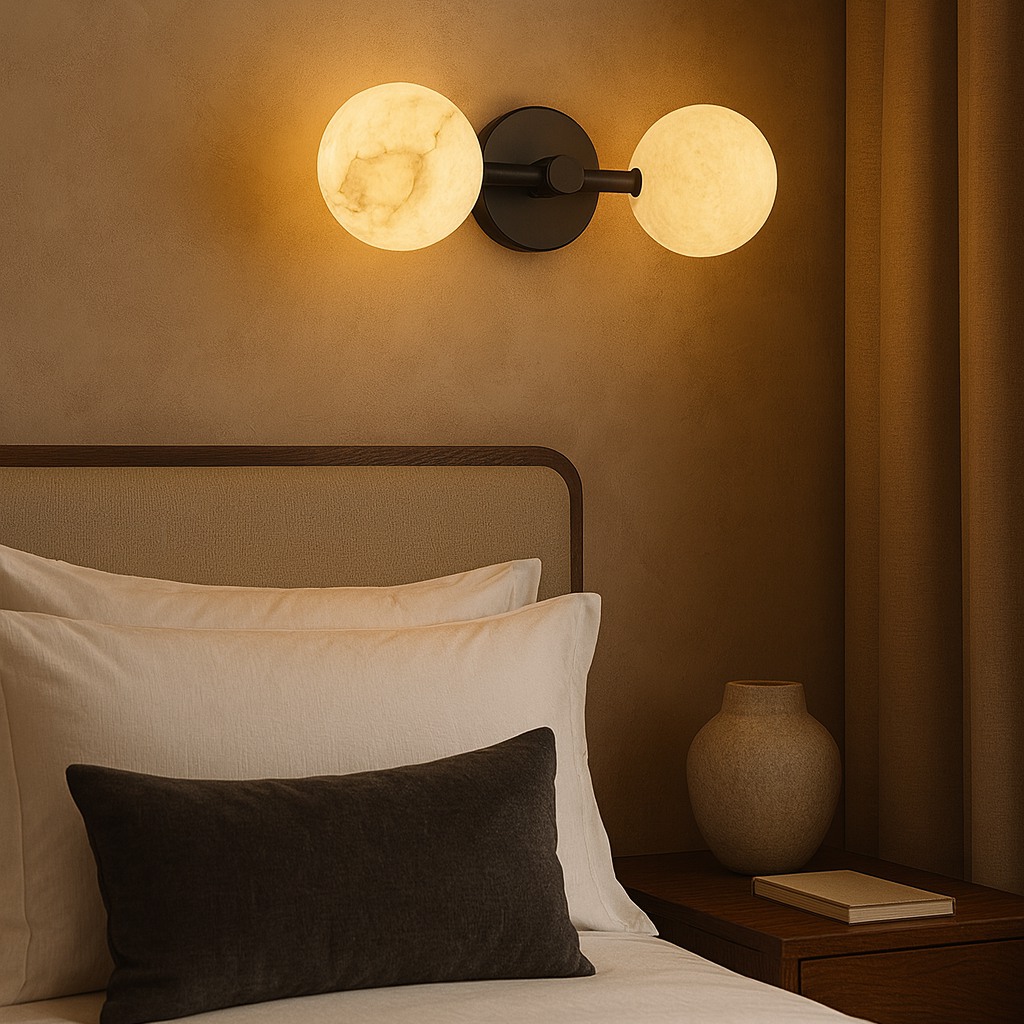 This elegant dual-alabaster wall sconce showcases two warm-glowing stone globes balanced on a minimalist matte black frame. The natural cloud-like veining of each globe brings a sculptural presence and ambient radiance to the space. Ideal for boutique hotels, upscale residences, dining spaces, spa retreats, and architectural interiors seeking a refined yet modern decorative statement.
