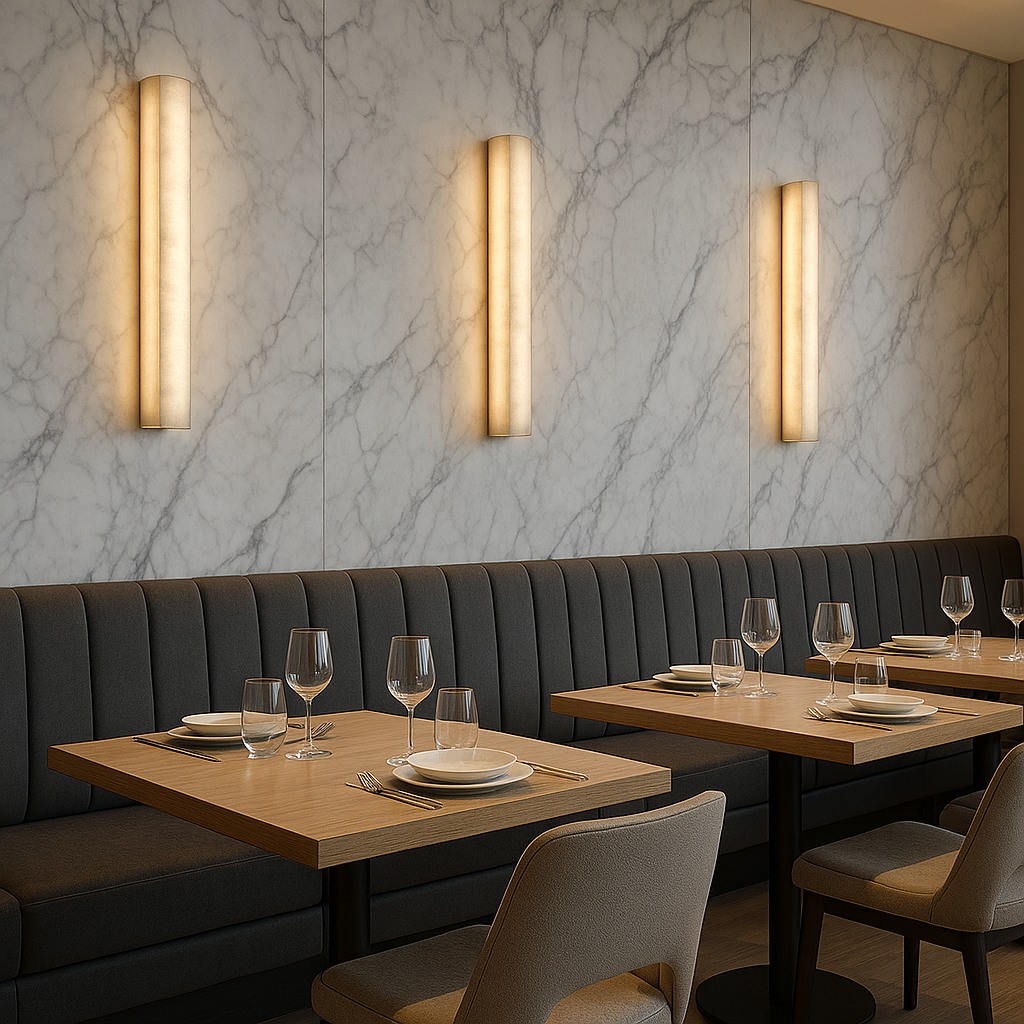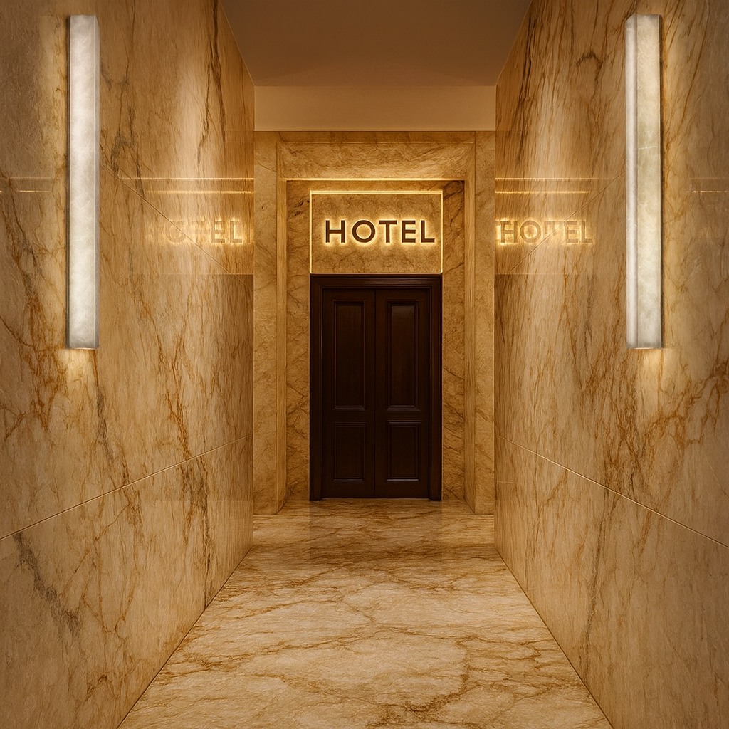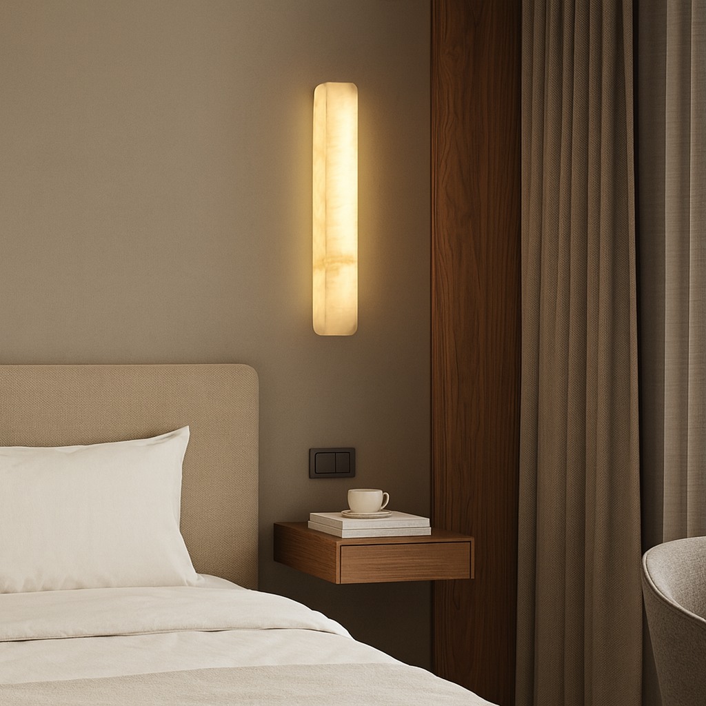 Rectangular alabaster wall sconce with integrated LED light source, designed to provide soft and even ambient illumination. The natural alabaster diffuser reveals unique stone veining when lit, offering warm visual texture suitable for residential and hospitality applications. Ideal for hallways, bathrooms, vanities, bedrooms, restaurants, and lobby accent lighting.