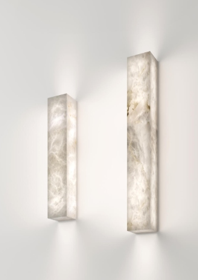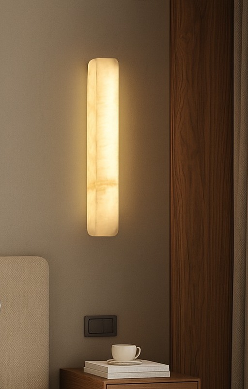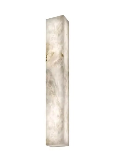 Rectangular alabaster wall sconce with integrated LED light source, designed to provide soft and even ambient illumination. The natural alabaster diffuser reveals unique stone veining when lit, offering warm visual texture suitable for residential and hospitality applications. Ideal for hallways, bathrooms, vanities, bedrooms, restaurants, and lobby accent lighting.