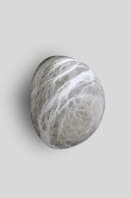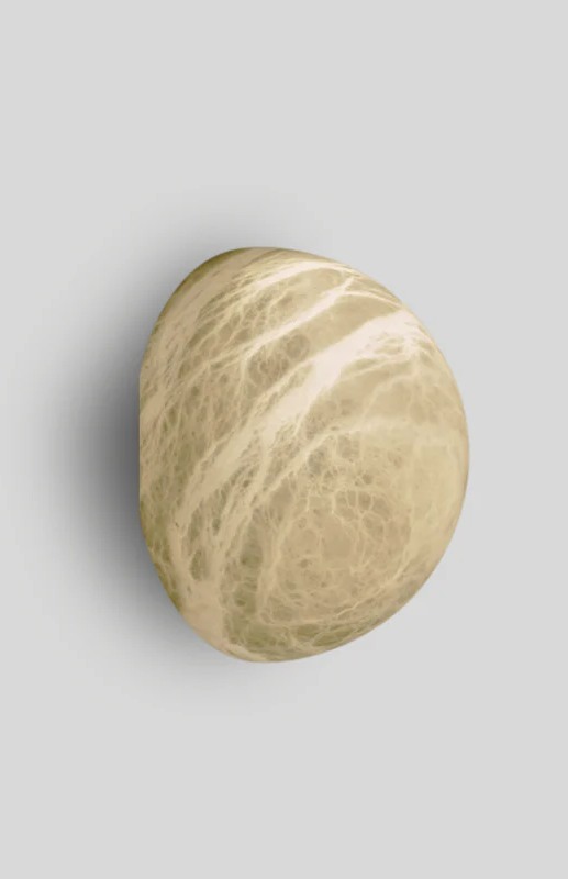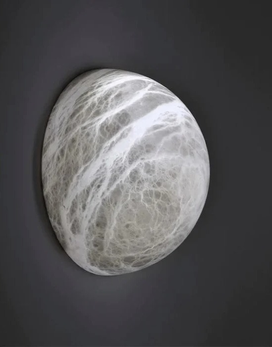 This wall light features a beautifully textured alabaster diffuser, showcasing dramatic natural veining and organic depth. When illuminated, the stone emits a warm, ambient glow, creating a calming and refined atmosphere. Ideal for residential and hospitality projects seeking natural elegance and visual character.
