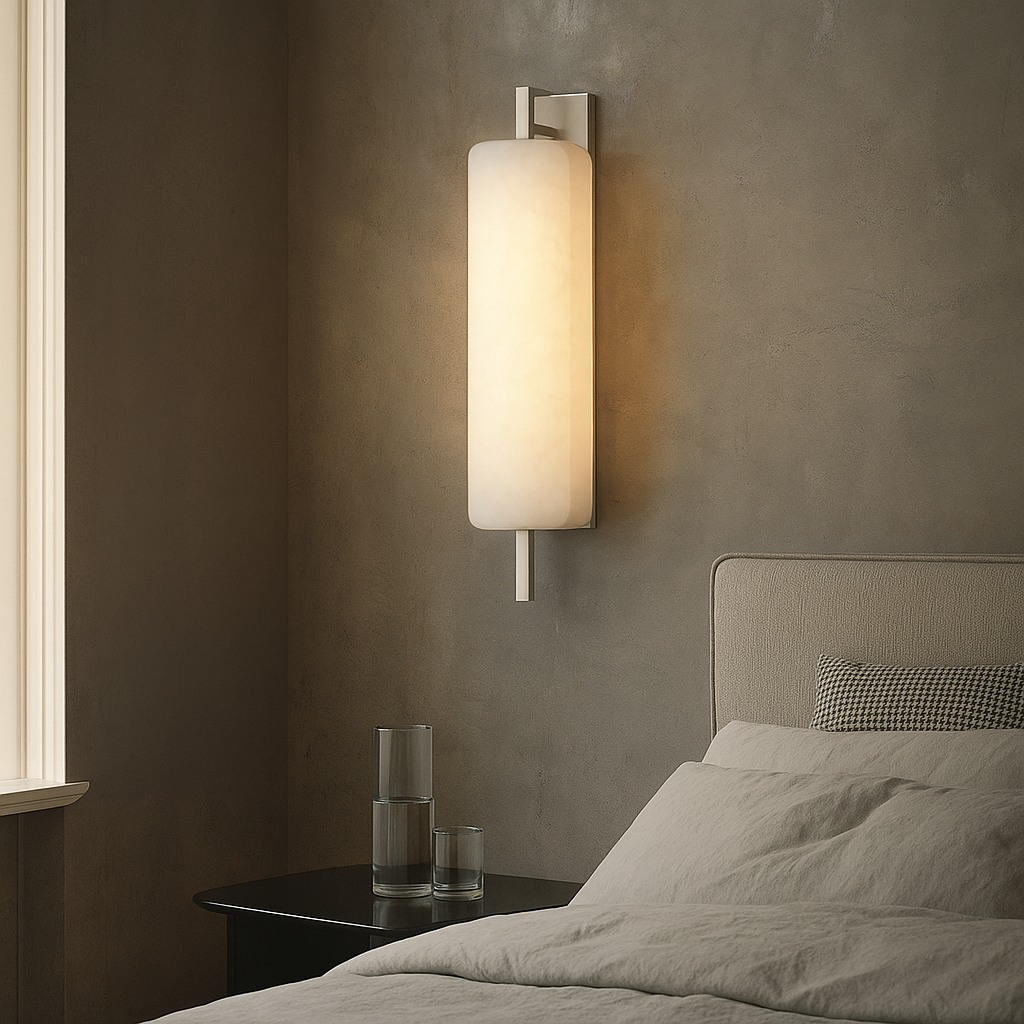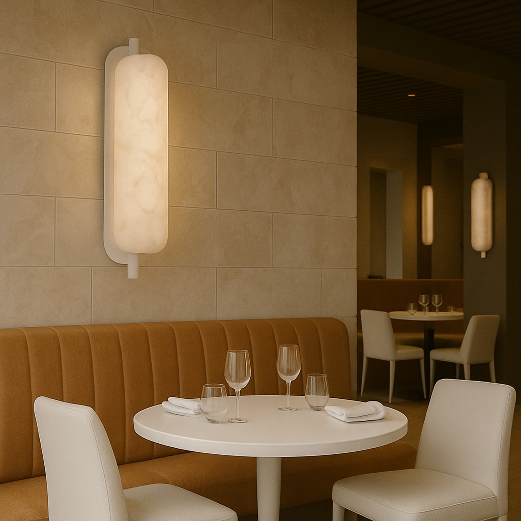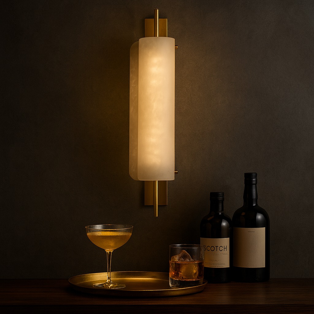 Crafted from hand-selected alabaster, this wall sconce showcases a stunning fusion of nature and modern elegance. The light radiates softly through the stone, highlighting its unique veining while a sleek brushed brass bar adds architectural definition and luxury presence. Ideal for upscale hotels, residential projects, spas, and refined commercial interiors. This piece doubles as both illumination and art — minimal, timeless, and beautifully atmospheric.