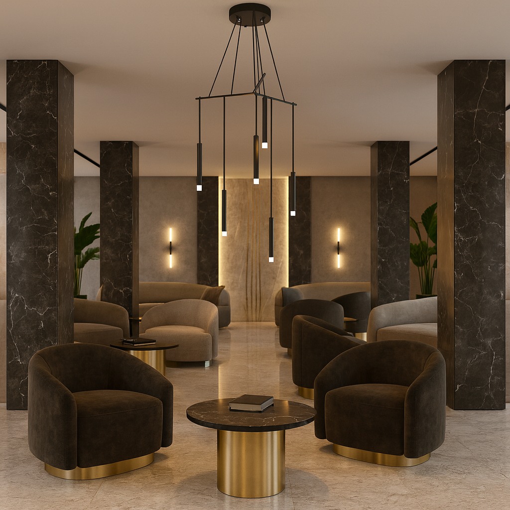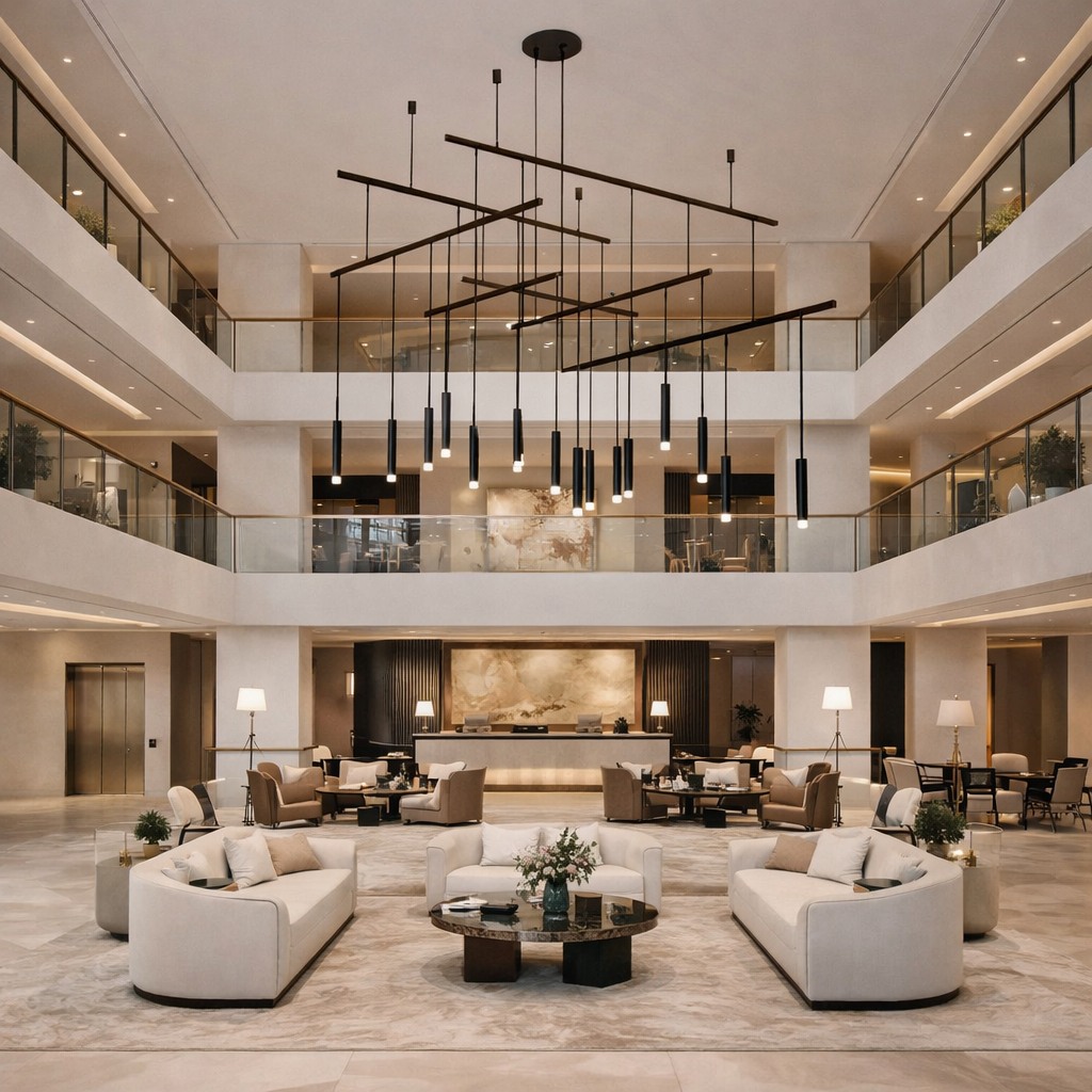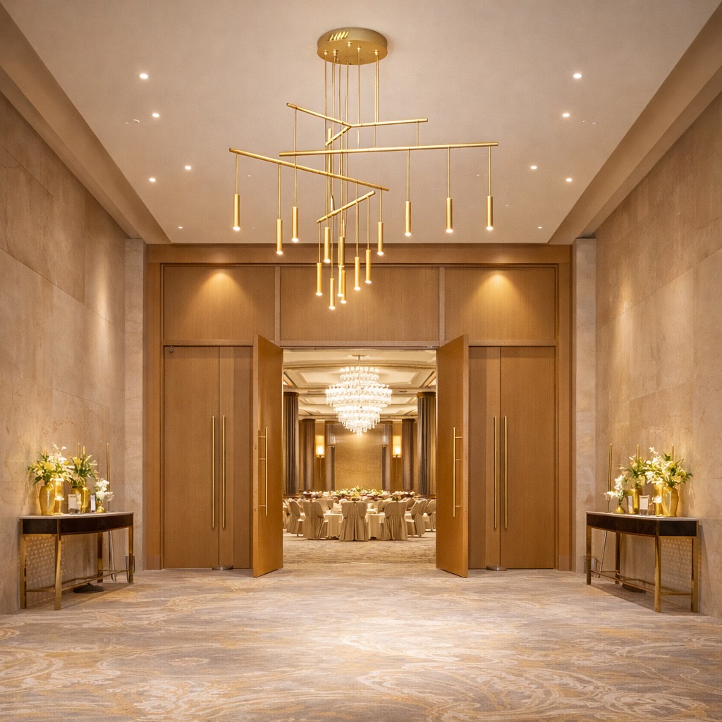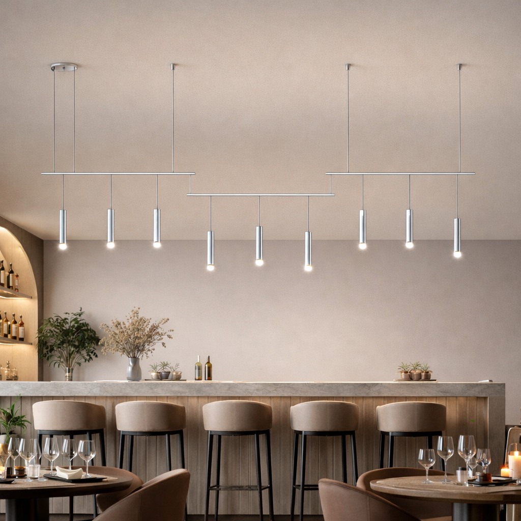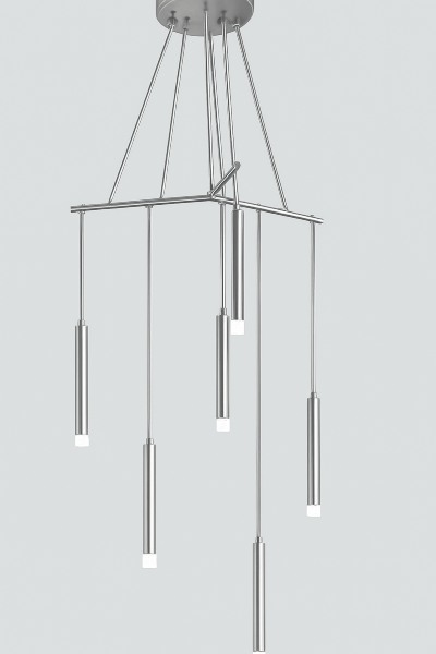 This sculptural chandelier combines intersecting linear elements with cascading pendants to create a bold yet refined architectural composition. The layered geometry introduces depth and movement, while the minimalist design delivers an elegant, contemporary statement ideal for grand spaces, atriums, and luxury interiors.
