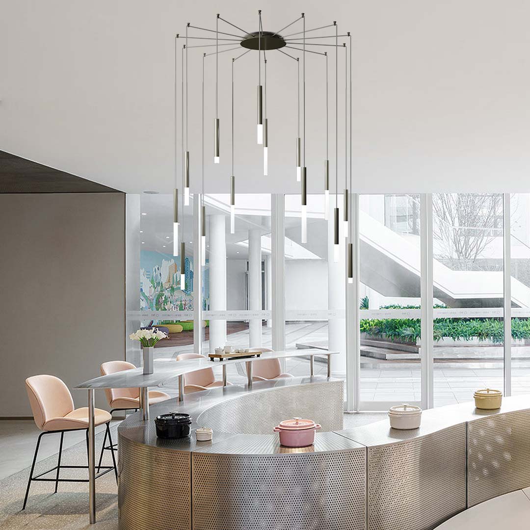 Each Chamonix B pendant element is machined from a block of aluminum. It features a direct lighting component and is available with 1 to 35 elements or more. Flat lens, acrylic, and bubble acrylic options are available. Over 6,500 color finishes and suspension cable lengths are offered. Ships fully assembled.