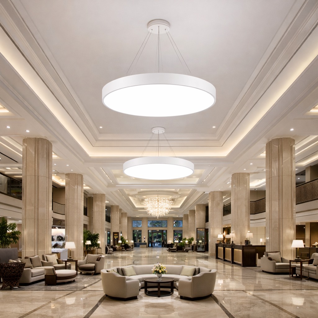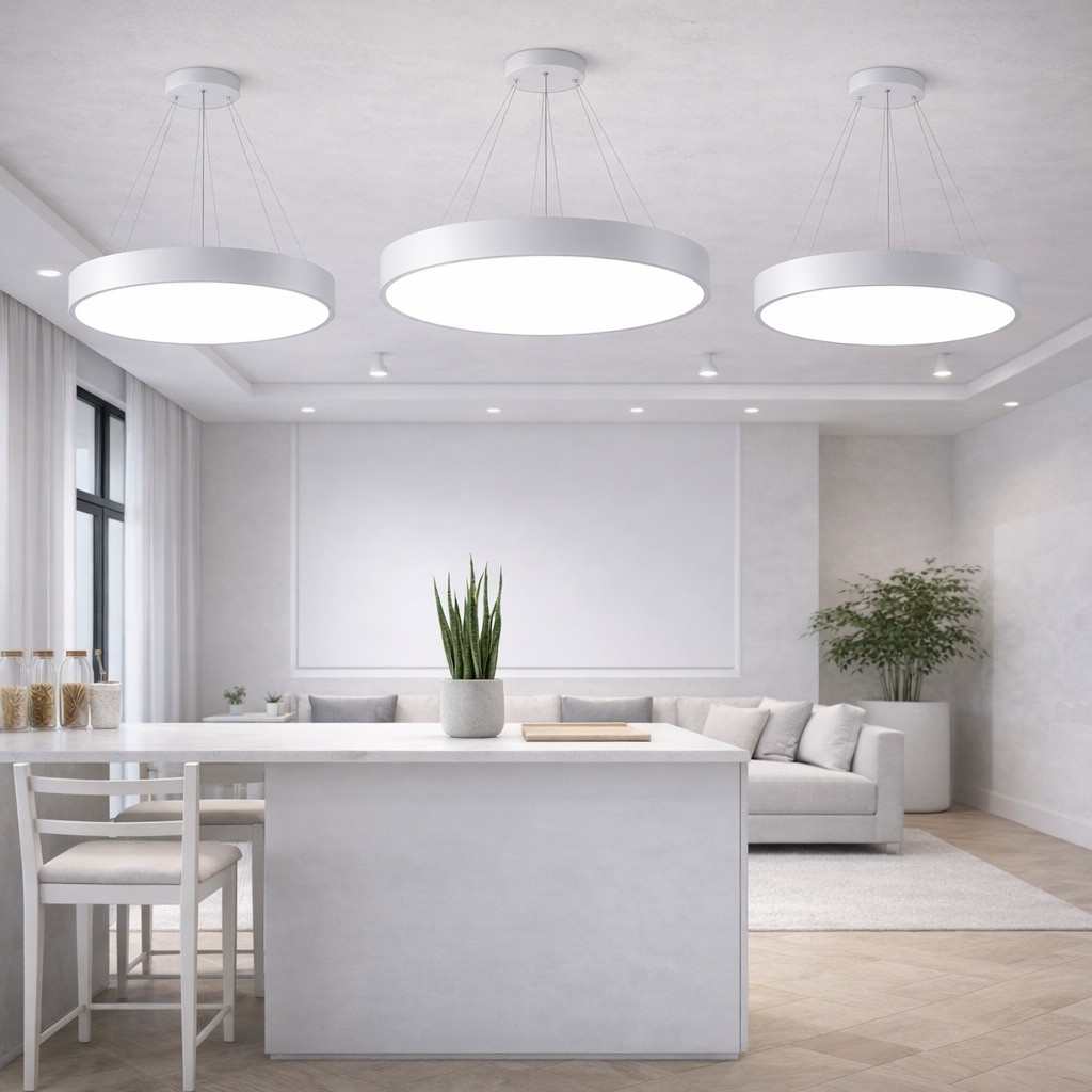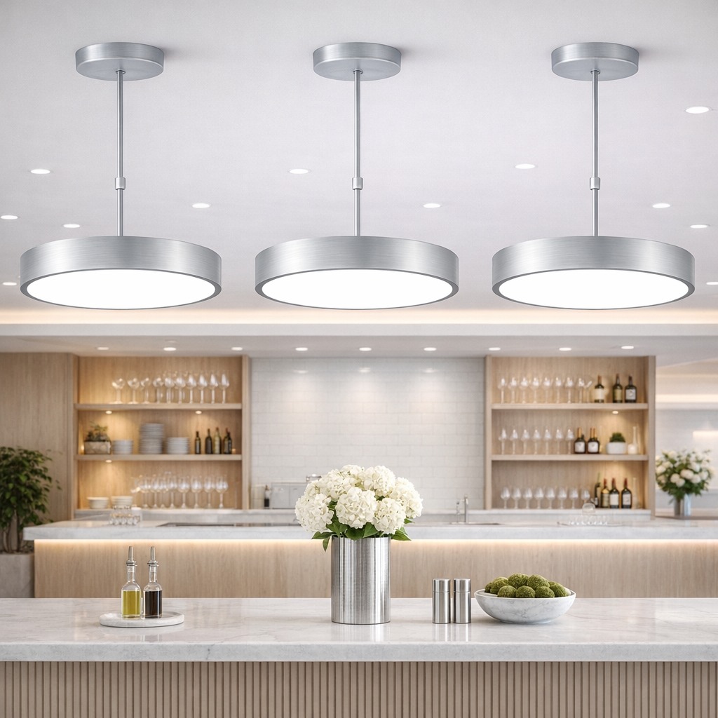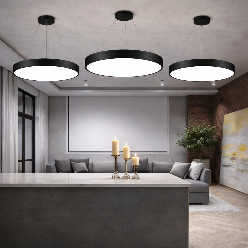 This contemporary drum pendant features a clean circular form with a smooth metal housing and a softly diffused luminous surface. The minimalist silhouette delivers balanced, glare-free illumination while maintaining a refined architectural presence. Ideal for residential, hospitality, and commercial interiors, it offers timeless simplicity with modern sophistication.