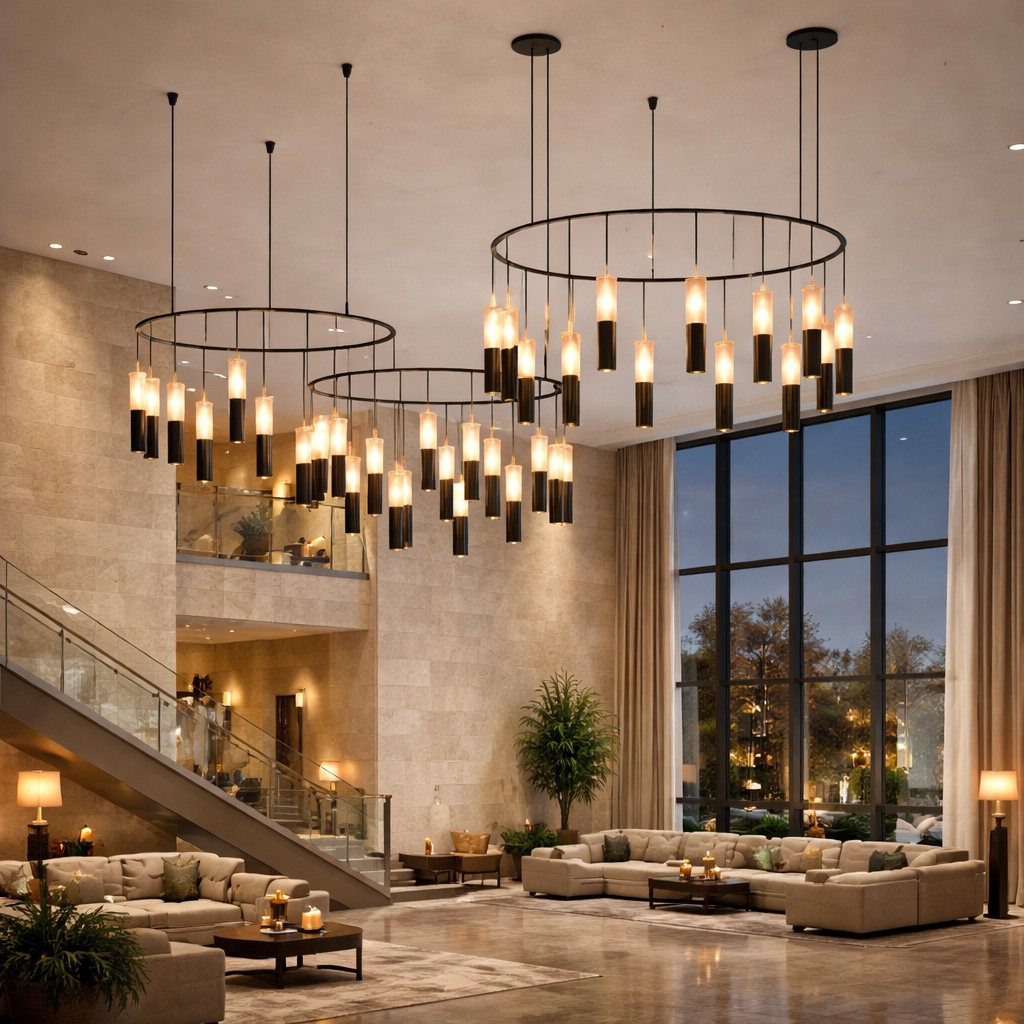 Modular ring-based chandelier system with clustered acrylic pendants, offering 360° ambient illumination and direct downlight for large-scale architectural installations
