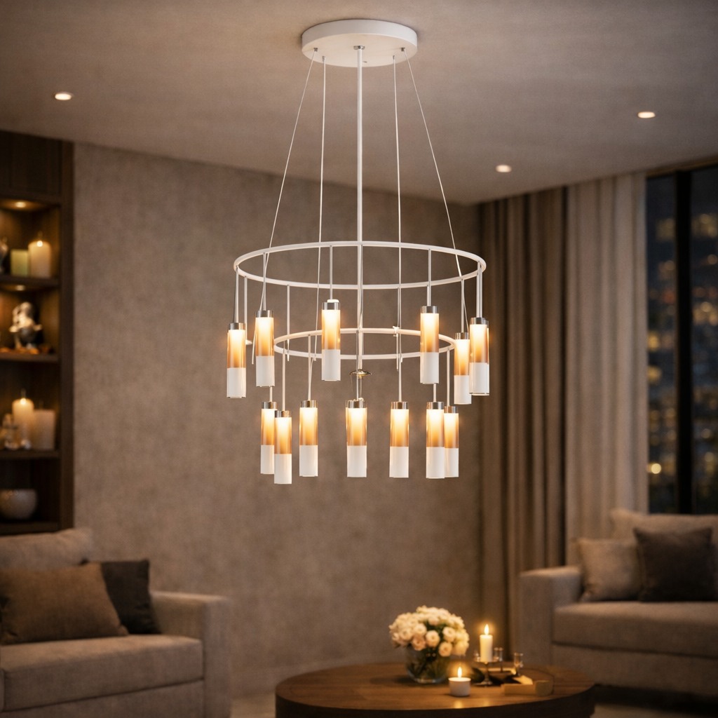 Multi-tier chandelier system combining illuminated acrylic pendants with concentric aluminum rings, delivering 360° ambient glow and downward task light for dramatic vertical spaces.