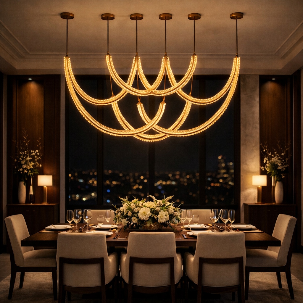 Alta Collection redefines architectural lighting through sculptural leather and light. Hand-finished leather straps flow effortlessly from the ceiling, carrying a soft, continuous glow that feels both tailored and organic. The contrast of supple leather with refined metal canopies creates a sense of movement, warmth, and understated luxury. Designed as a statement piece, Drift brings quiet sophistication to grand lobbies, luxury residences, and high-end hospitality interiors.