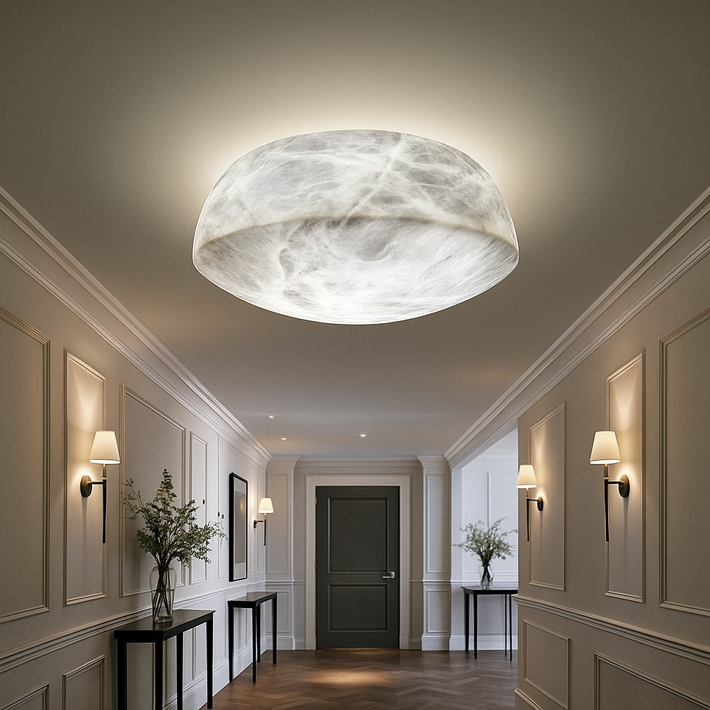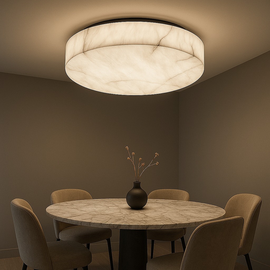 The Breckenridge Ceiling Collection celebrates the quiet luxury of natural alabaster, transformed into architectural ceiling forms that glow with warmth and depth. Each fixture is crafted to highlight the organic veining of genuine stone, allowing light to diffuse softly through the material and create an atmosphere that feels refined, calm, and enduring.