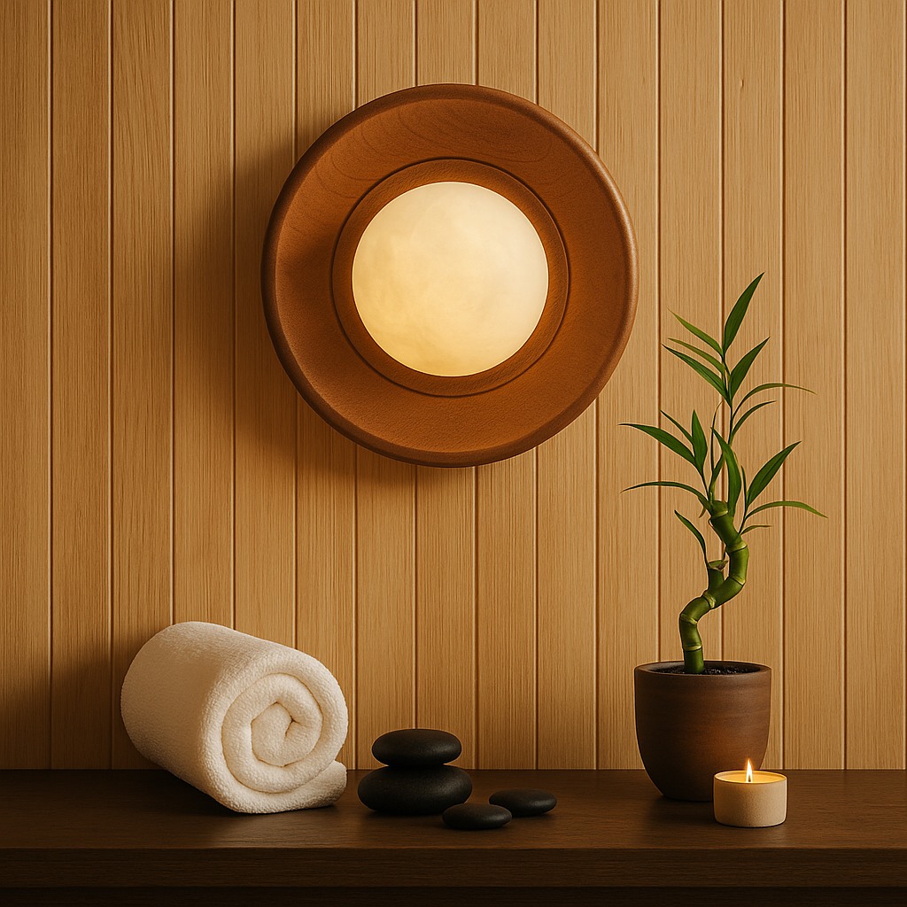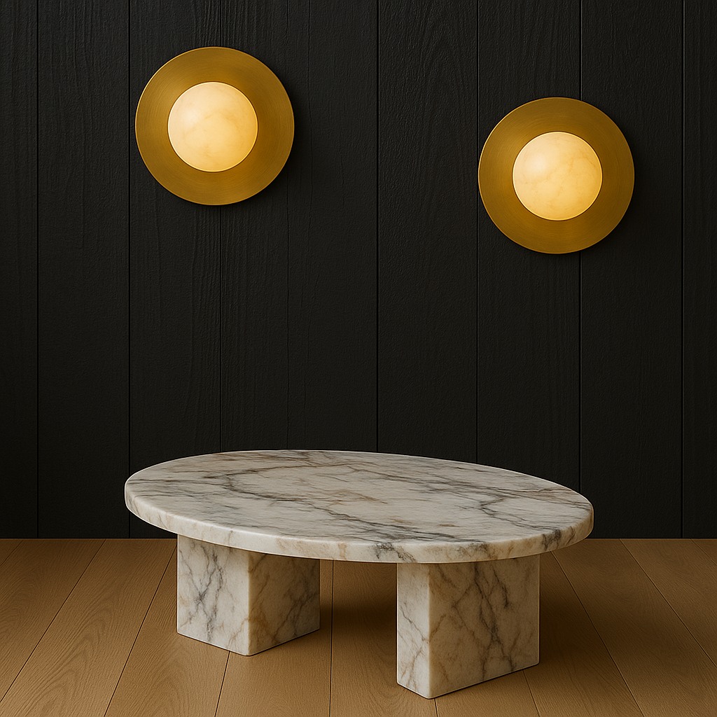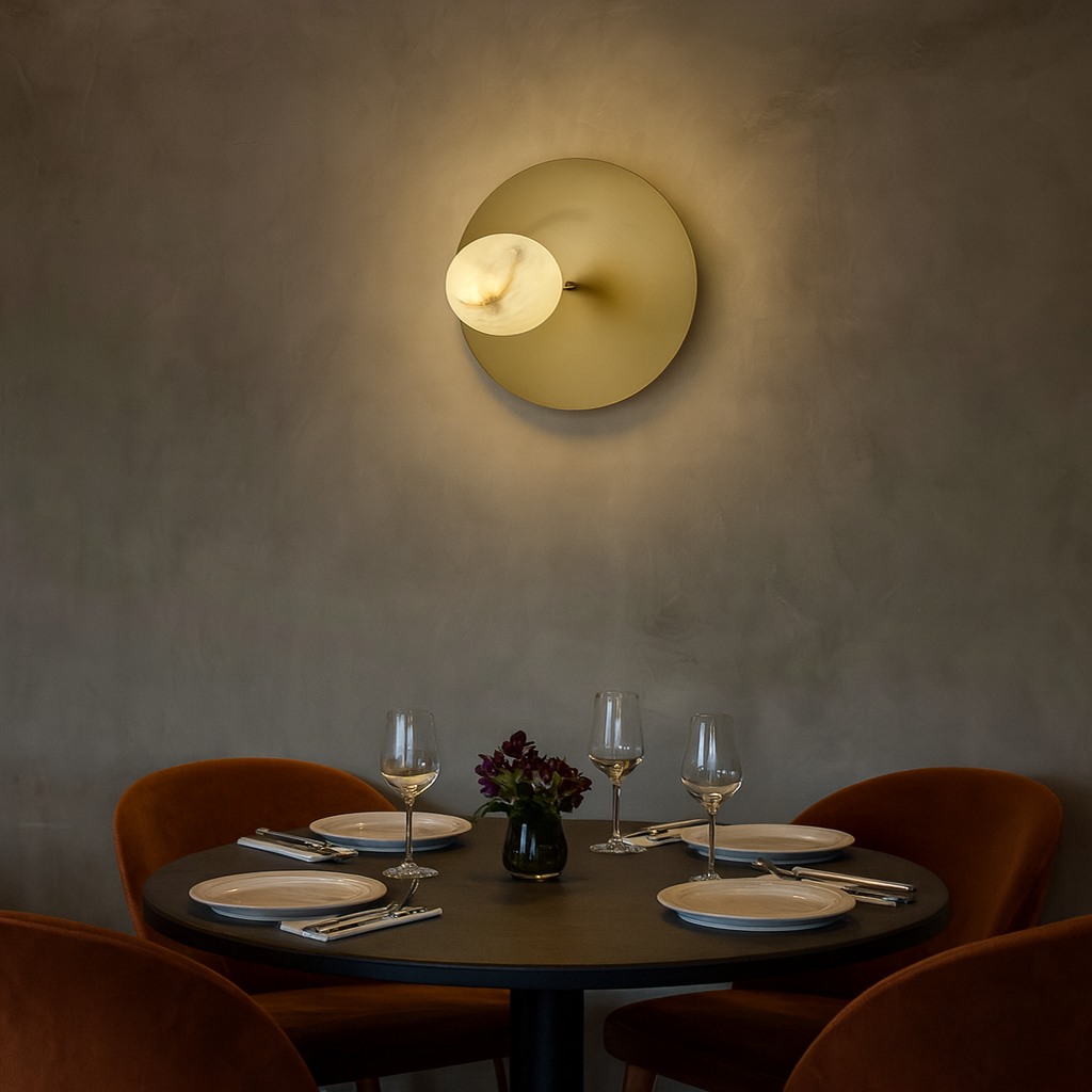 Breckenridge Disc showcases alabaster in pure, circular form. The balanced geometry and soft halo of light highlight the stone’s natural translucency, creating a timeless wall feature that blends seamlessly into both modern and classic interiors.