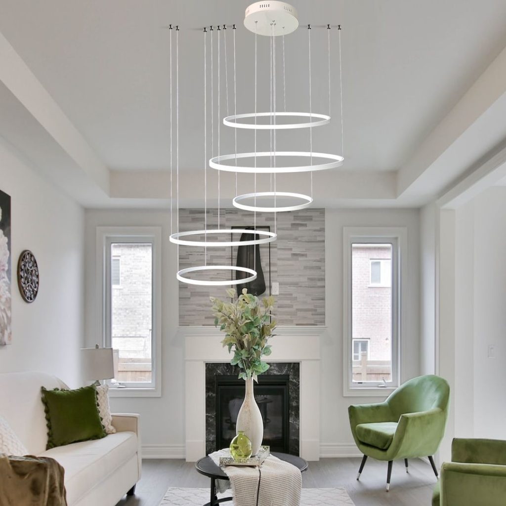The Keystone Kelvin temp selectable circular pendants are made of extruded with direct aluminum housing, glare-free flash lens smooth and streamline. Adjustable air craft cables. Sizes range from 15.75″ to 70.87″ and can be combined as desired to create multiple ring masterpieces. Tunable white and RGBW. Over 6500 powder coated colors, ships assembled.