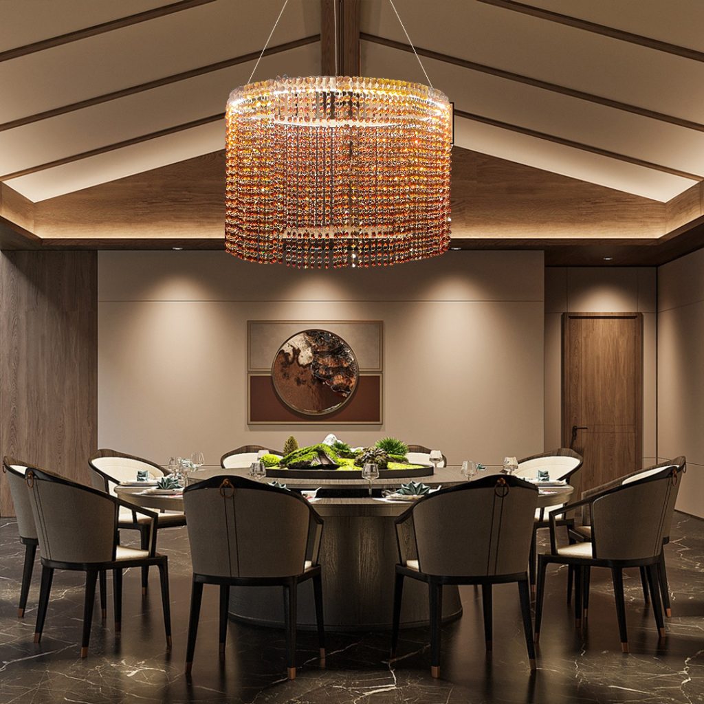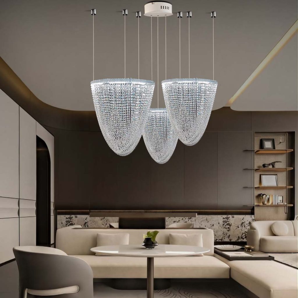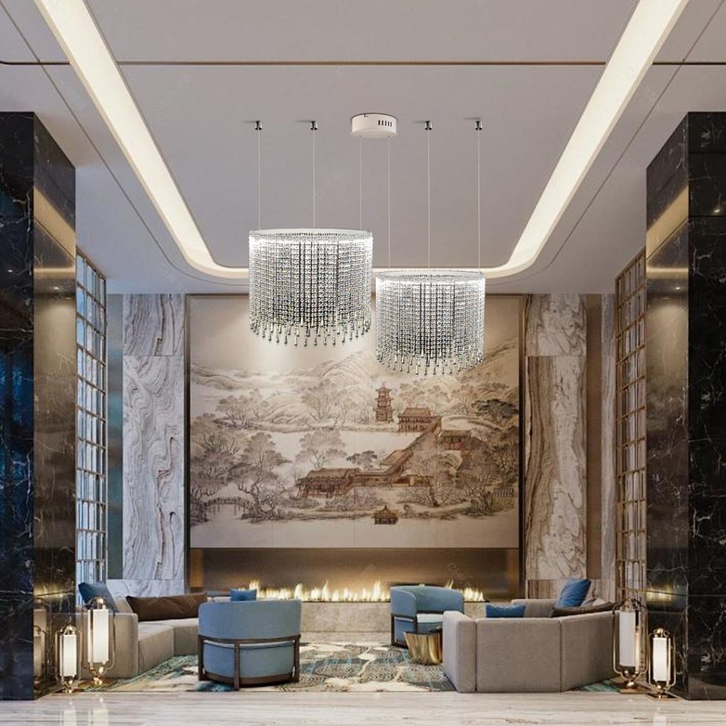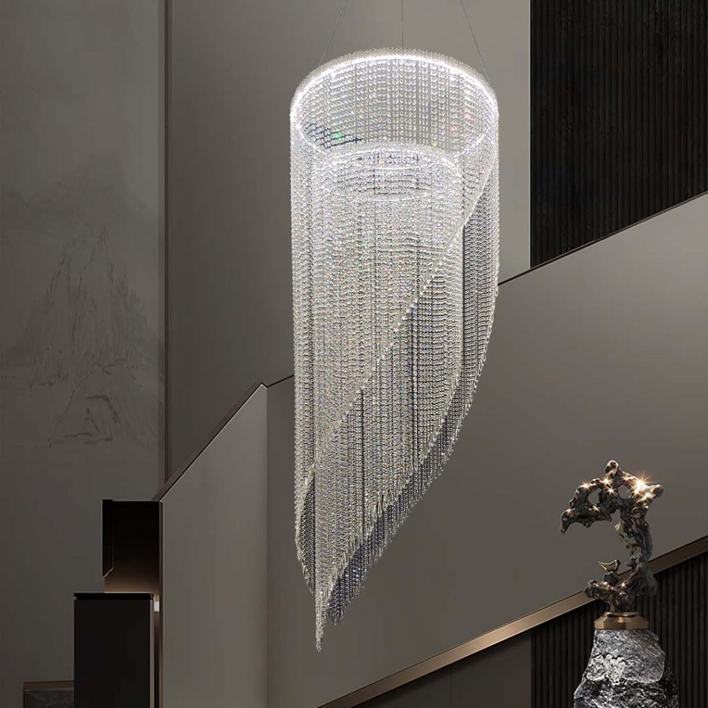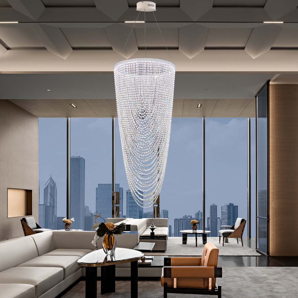 Designed for grand interiors, each piece balances structure and fluidity—transforming lobbies, atriums, and double-height environments into memorable visual experiences. From rhythmic crystal arrays to dramatic vertical cascades, the collection offers versatile compositions that adapt seamlessly to both contemporary and timeless architectural settings.