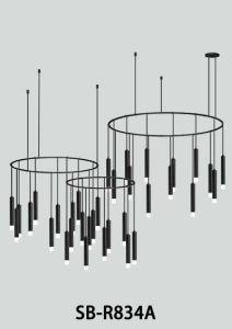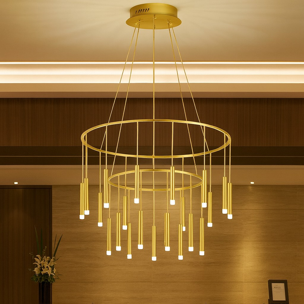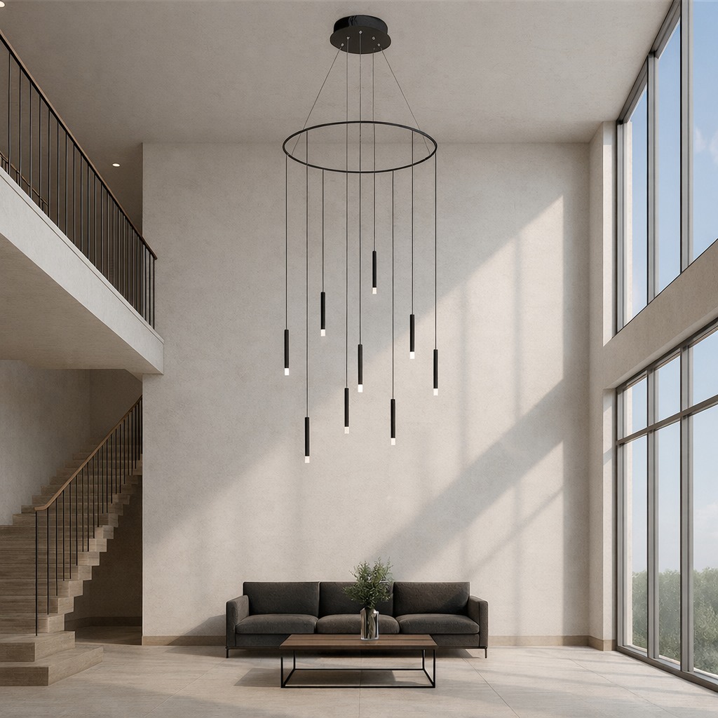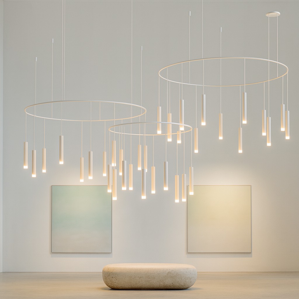 This sculptural ring chandelier features cascading slender pendants suspended from a refined circular frame, creating depth, movement, and visual rhythm. The minimalist design delivers a striking architectural statement while providing soft, ambient illumination—ideal for double-height spaces, lobbies, and luxury interiors.