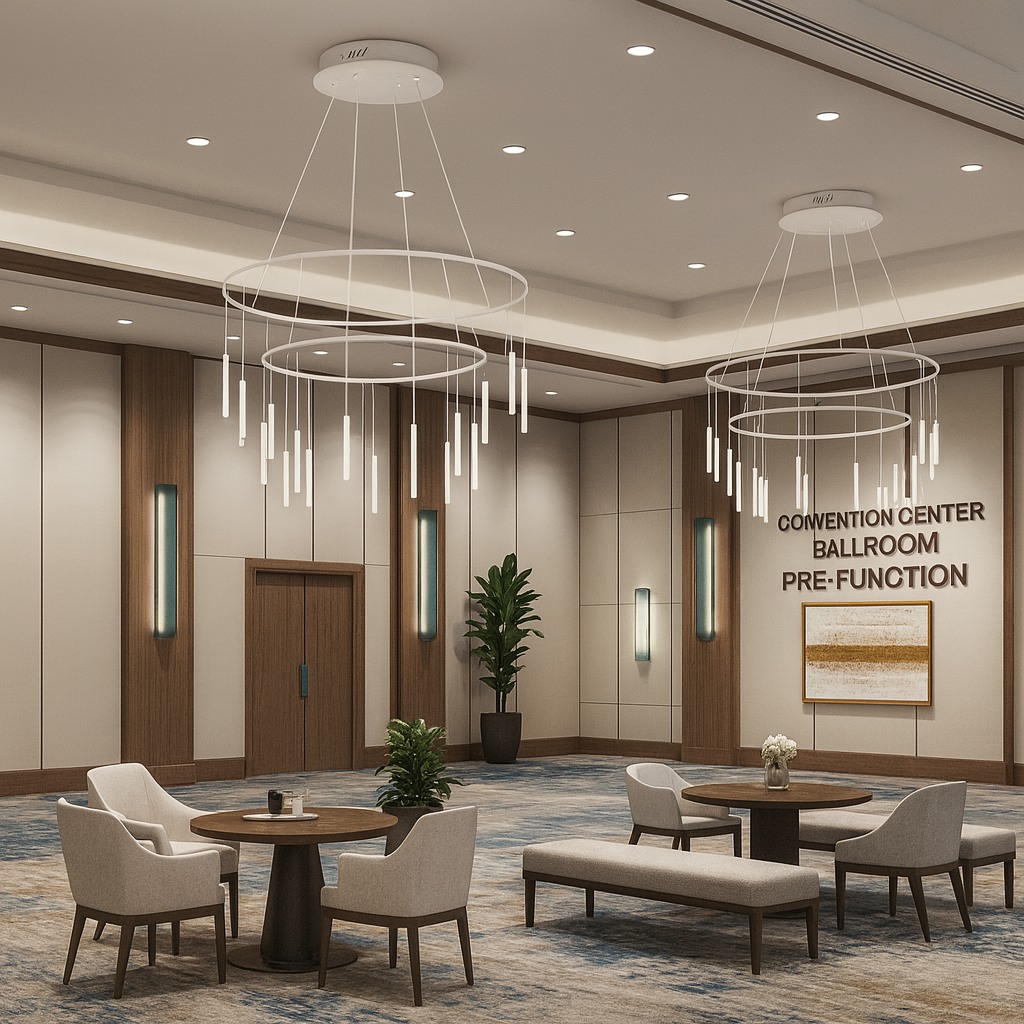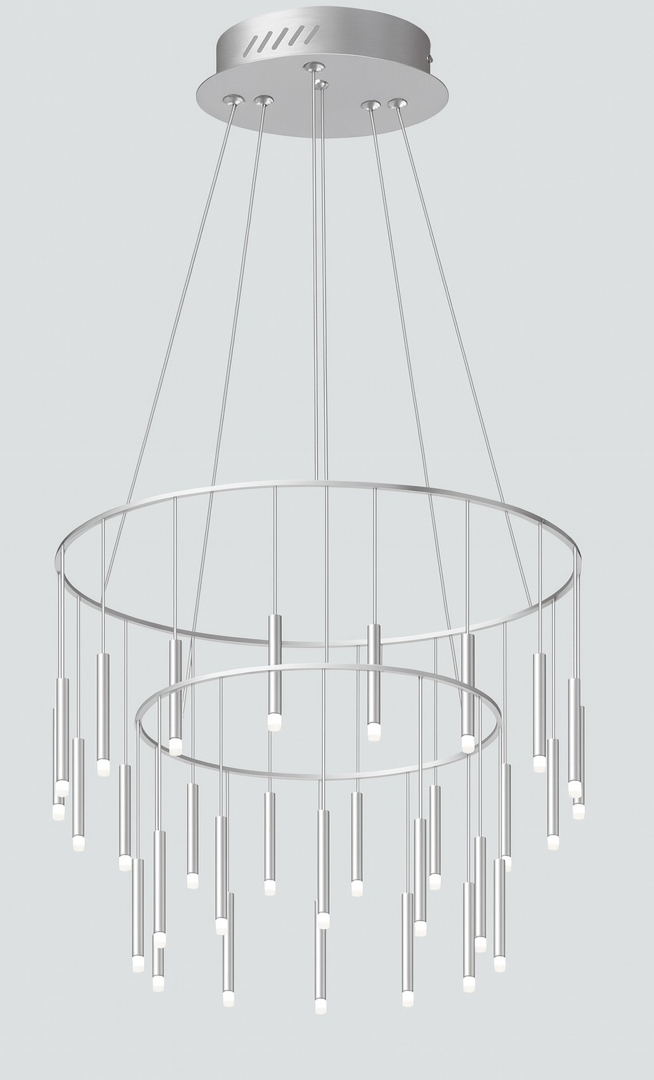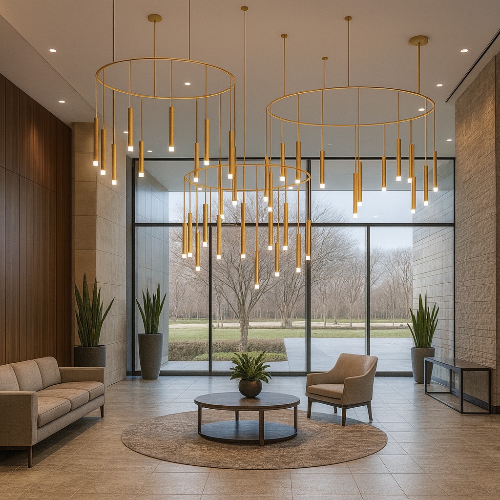 This sculptural ring chandelier features cascading slender pendants suspended from a refined circular frame, creating depth, movement, and visual rhythm. The minimalist design delivers a striking architectural statement while providing soft, ambient illumination—ideal for double-height spaces, lobbies, and luxury interiors.